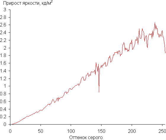 Далее мы измерили яркость 256 оттенков серого (от 0, 0, 0 до 255, 255, 255). График ниже показывает прирост (не абсолютное значение!) яркости между соседними полутонами: