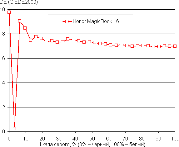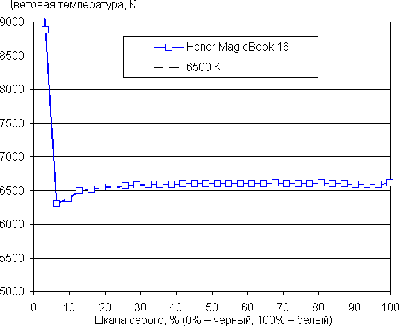По умолчанию баланс оттенков на шкале серого хороший, так как цветовая температура близка к стандартным 6500 К, и отклонение от спектра абсолютно черного тела (ΔE) ниже 10, что для потребительского устройства считается приемлемым показателем. При этом цветовая температура и ΔE мало изменяются от оттенка к оттенку — это положительно сказывается на визуальной оценке цветового баланса. (Самые темные области шкалы серого можно не учитывать, так как там баланс цветов не имеет большого значения, да и погрешность измерений цветовых характеристик на низкой яркости большая.)