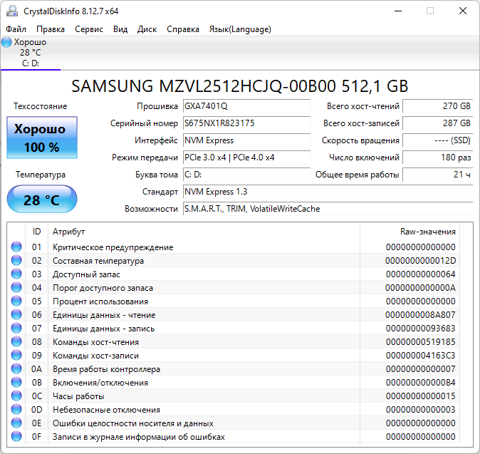 | Накопитель | 1 × SSD 512 ГБ (Samsung MZVL2512HCJQ), M.2 2280, NVMe 1.3, PCIe 3.0 x4 | |