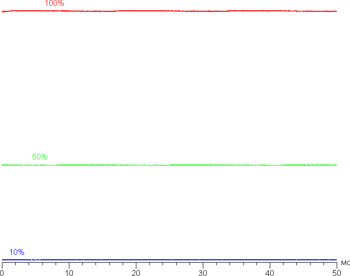 На любом уровне яркости значимая модуляция подсветки отсутствует, поэтому нет и никакого мерцания экрана. В доказательство приведем графики зависимости яркости (вертикальная ось) от времени (горизонтальная ось) при различных значениях настройки яркости: