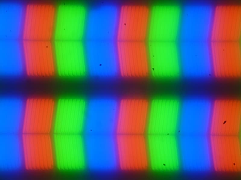В этом ноутбуке используется матрица типа IPS. Микрофотографии демонстрируют типичную для IPS структуру субпикселей (черные точки — это пыль на матрице фотоаппарата):