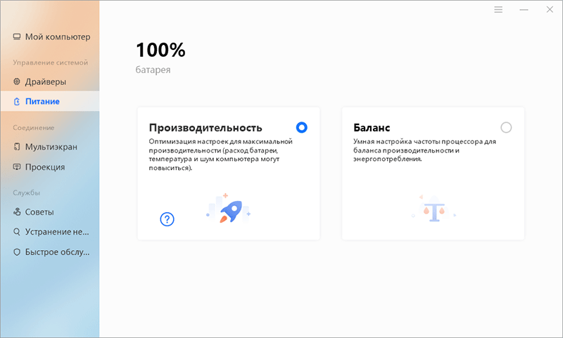 Их можно переключать напрямую сочетанием клавиш Fn+P, но нужно помнить, что производительный режим активируется только при питании ноутбука от электросети и заряде аккумулятора не ниже 20%. Сбалансированный же режим доступен всегда.
