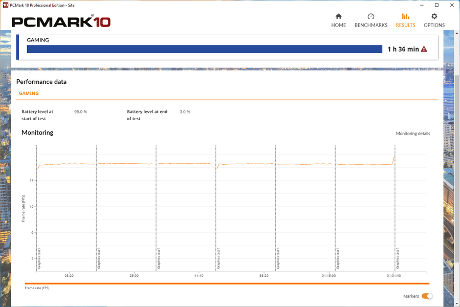 В условно-игровом режиме ноутбук смог проработать чуть более полутора часов, а в остальных трех режимах тестирования полного заряда аккумулятора хватило на 10-11 часов, что весьма неплохо для модели с 16-дюймовым экраном и довольно производительной аппаратной конфигурацией.