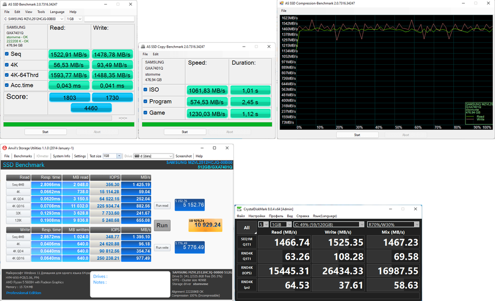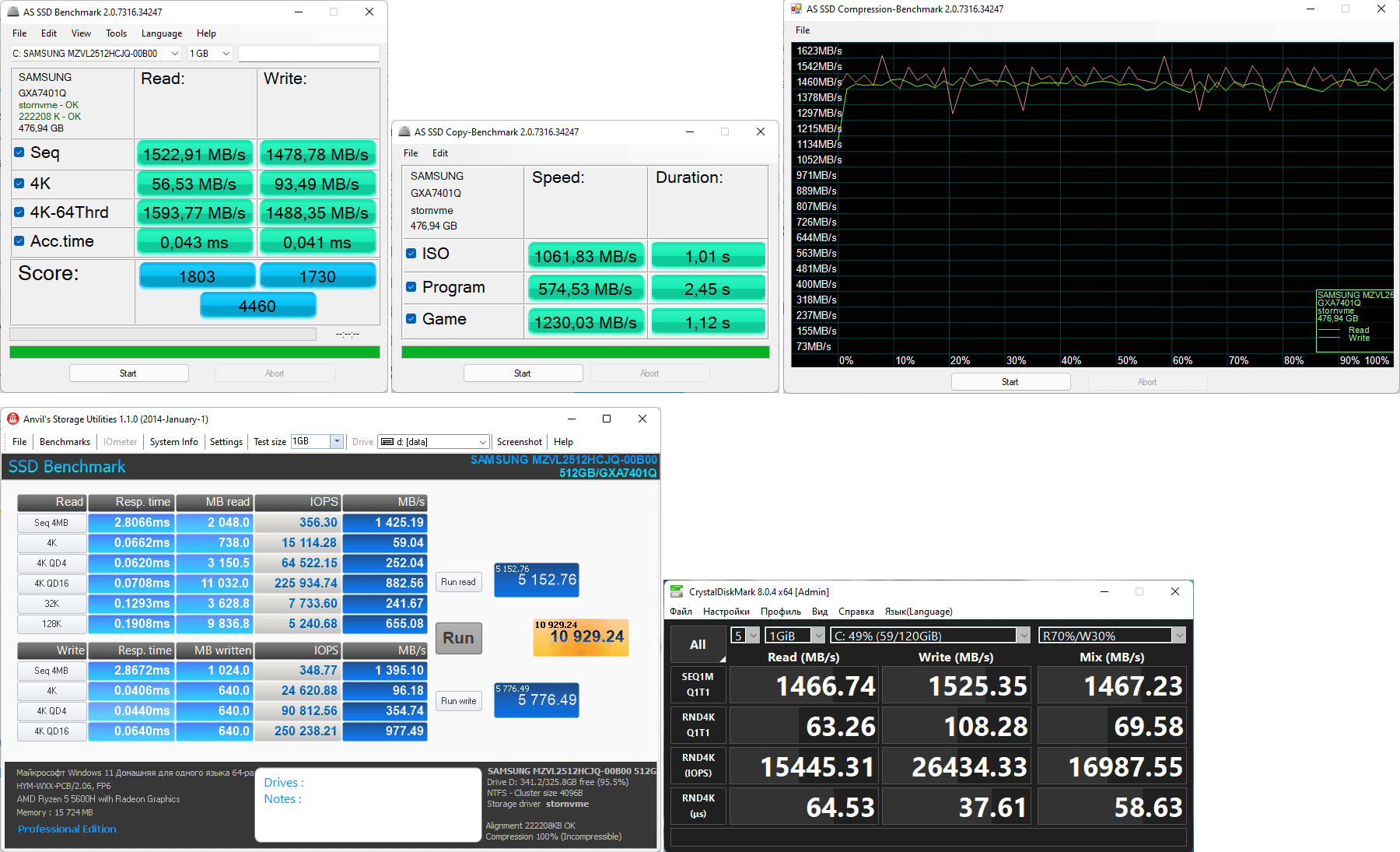 Тестирование производительности накопителя нового MagicBook 16 подтвердило его высокие скорости, однако это справедливо только при работе ноутбука от электросети. Для сравнения далее мы приводим два скриншота с результатами тестирования SSD в двух режимах.