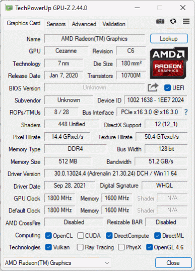 | Видеоподсистема | AMD Radeon Graphics (Radeon RX Vega 6) | |