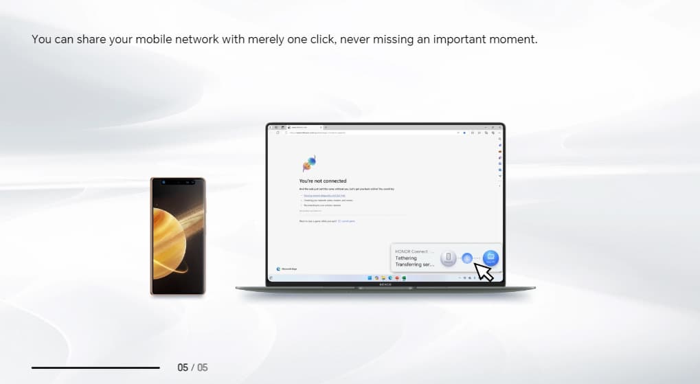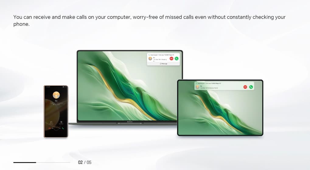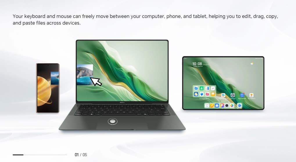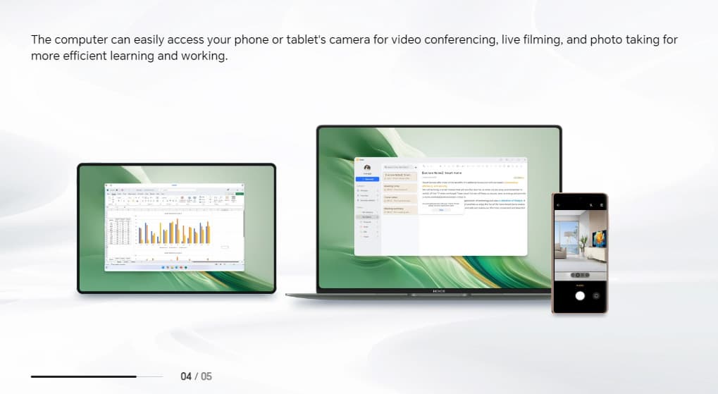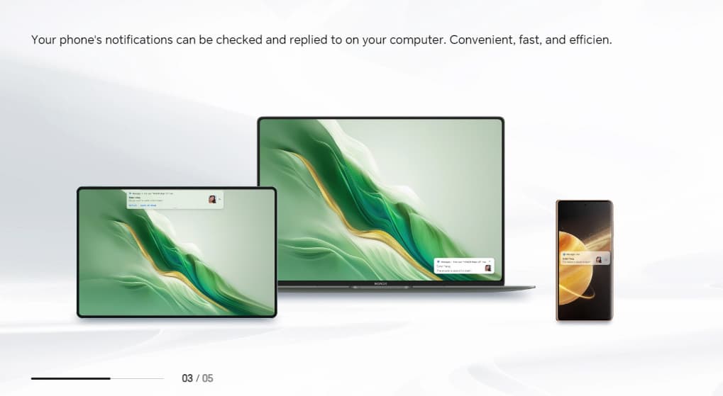 С помощью технологии Honor Share можно проецировать экран смартфона, перетаскивать файлы, отвечать на звонки или обмениваться сообщениями. Также можно проецировать экран ультрабука на телевизор или монитор, а функция «Мультиэкран» позволяет быстро передавать файлы или изображения.
