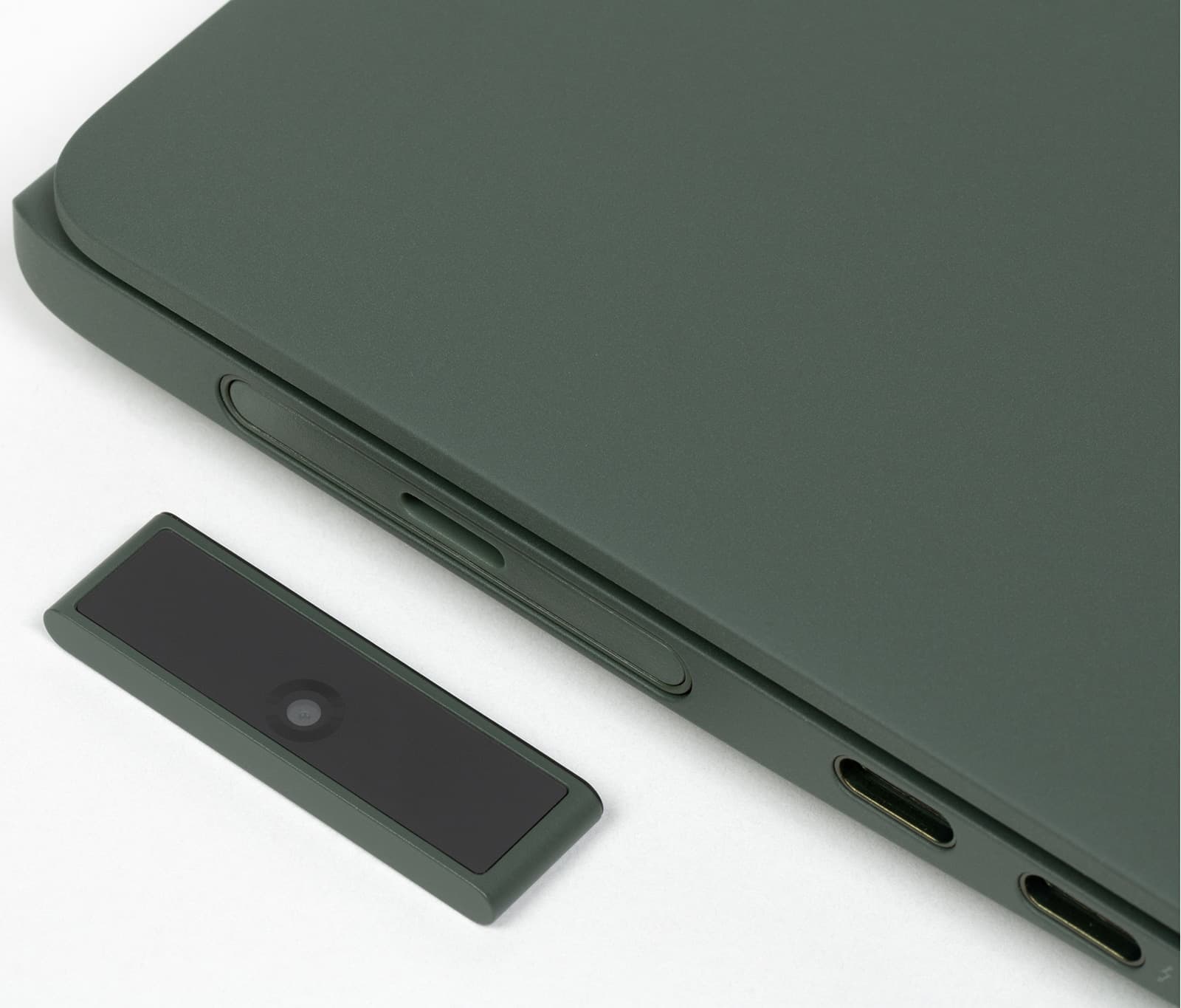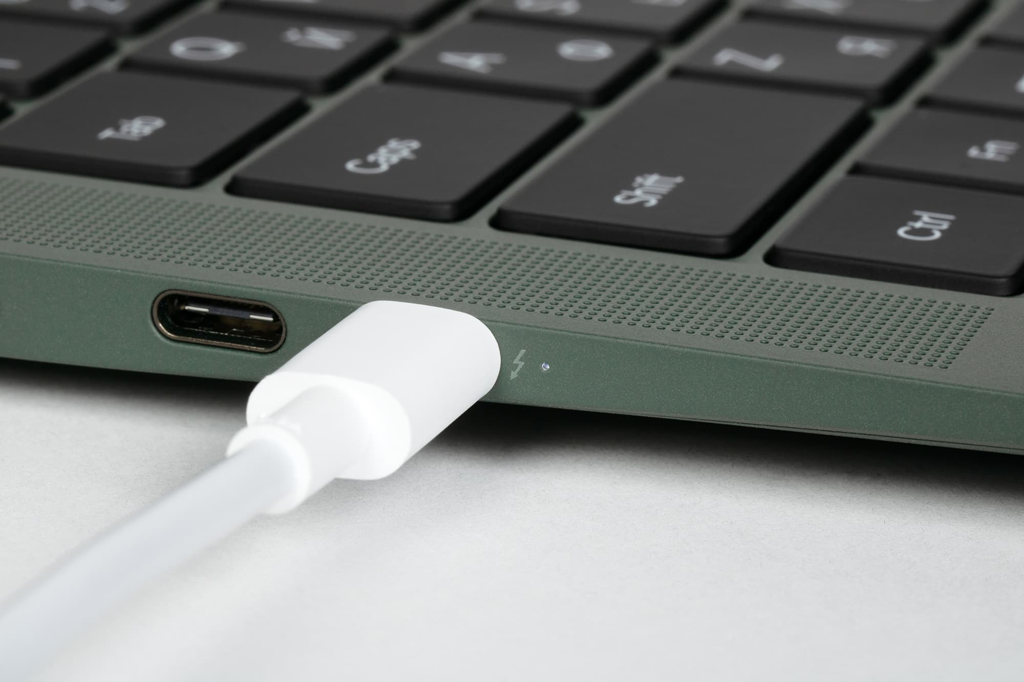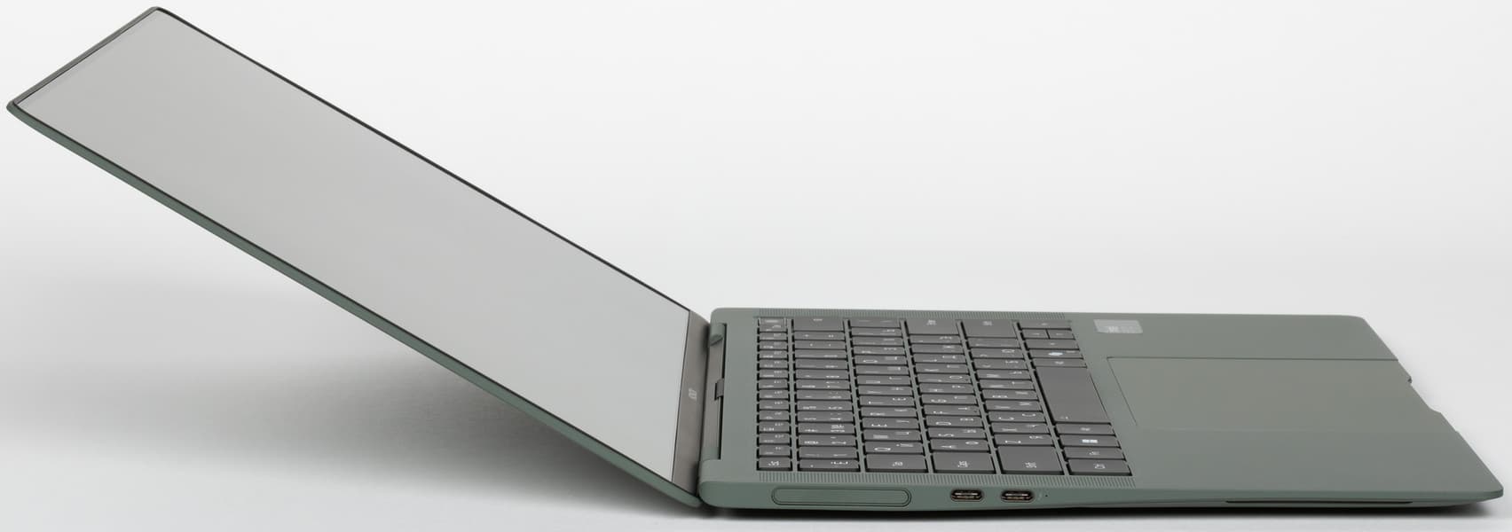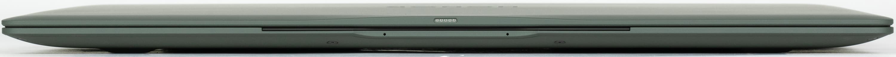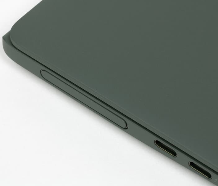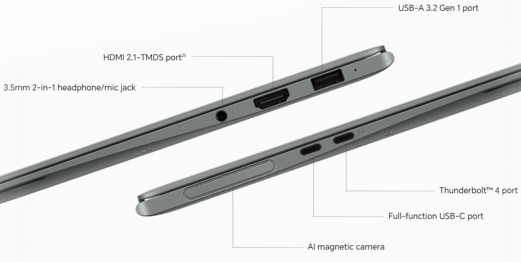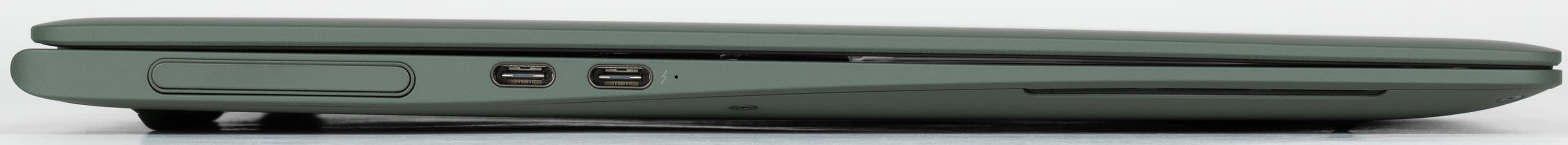 Слева размещен слот с веб-камерой, порт Thunderbolt 4 (USB Type-C) с поддержкой вывода изображения, зарядки и обратной зарядки, еще один USB 3.2 Type-C Gen2 (10 Гбит/с) и маленький индикатор зарядки.