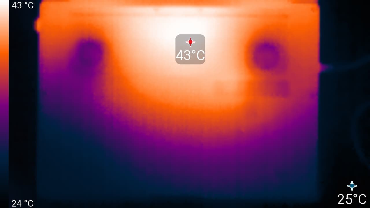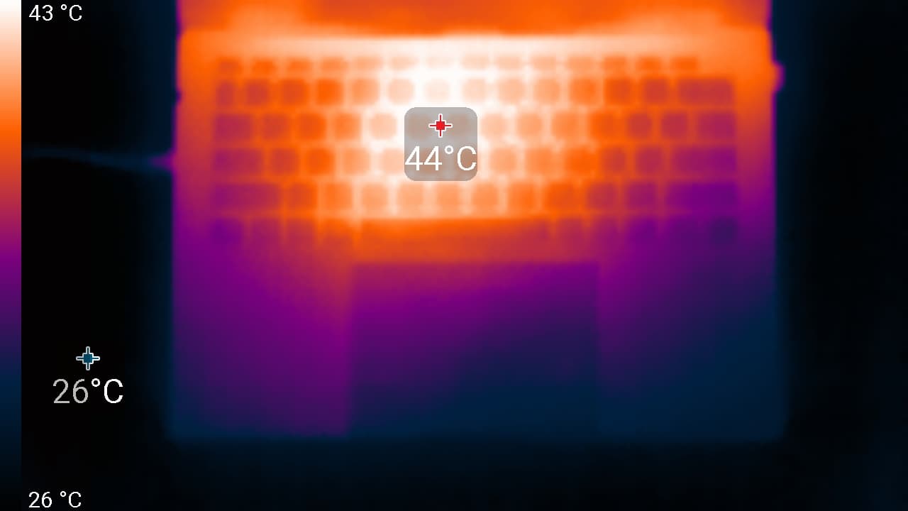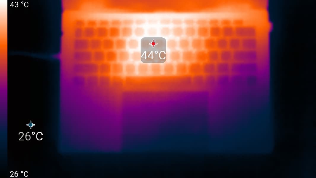 Под максимальной нагрузкой работать с клавиатурой комфортно, так как места под запястьями греются очень слабо. Держать ноутбук на коленях неприятно, поскольку нагрев днища колени чувствуют. Блок питания греется очень сильно, поэтому при долговременной работе с большой производительностью обязательно нужно следить, чтобы он не был ничем накрыт.