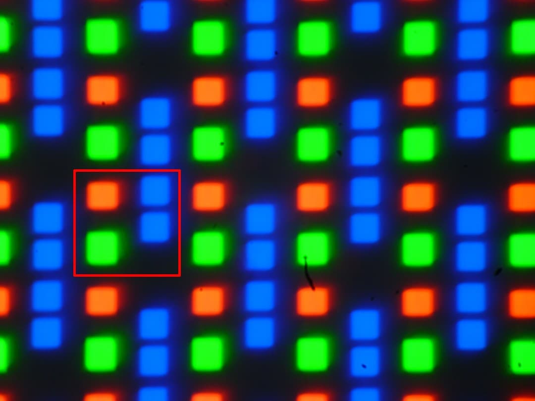 В этом OLED-экране полноцветное изображение создается с помощью субпикселей трех цветов — красного (R), зеленого (G) и синего (B) в равном количестве. Это подтверждается фрагментом микрофотографии (красной рамкой обведен фрагмент 1 на 1 пиксель; синий субпиксель сдвоенный):