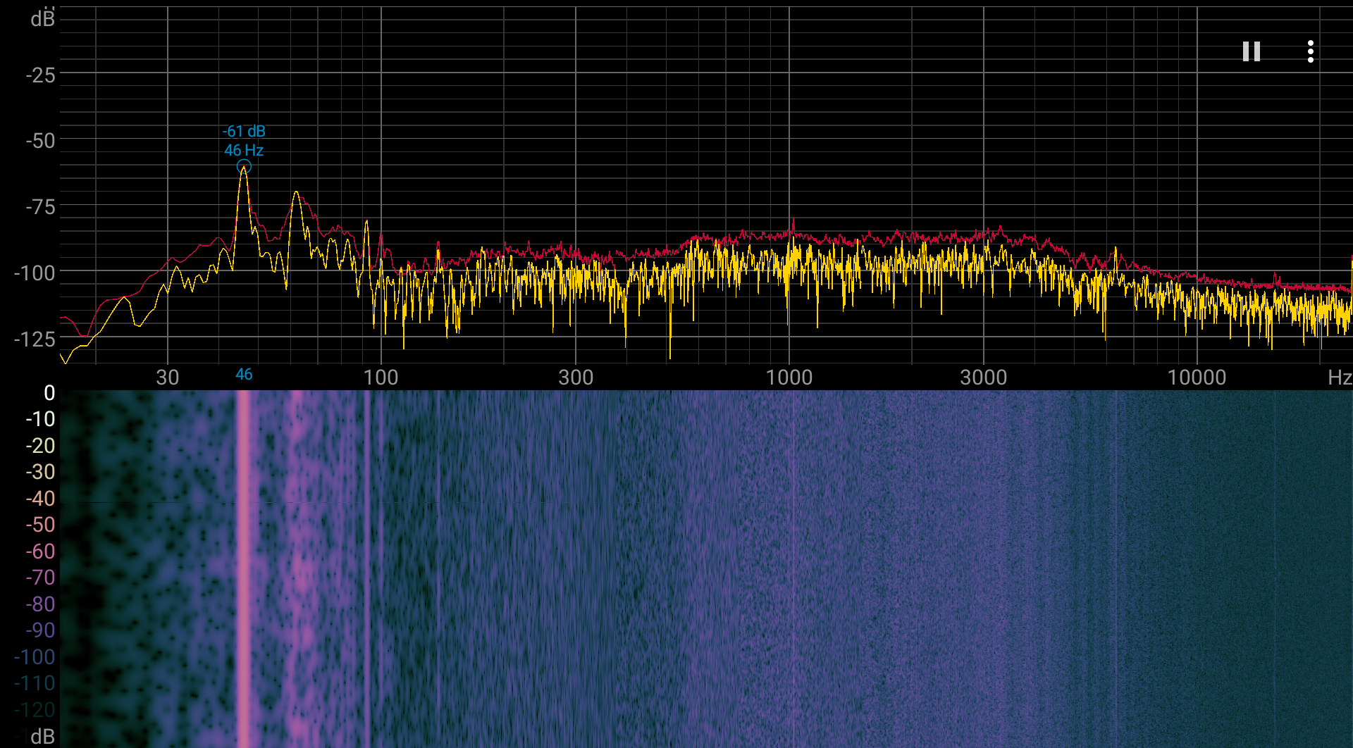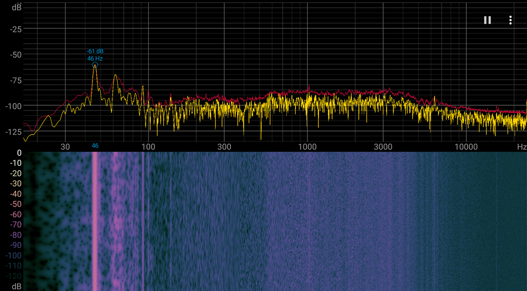 Если ноутбук не нагружать совсем, то его система охлаждения в указанных выше условиях всё равно не может долговременно работать в пассивном режиме, однако шум при этом очень низкий. Характер шума даже под высокой нагрузкой ровный и раздражения не вызывает. Спектрограмма, полученная под максимальной нагрузкой, достаточно ровная, и в диапазоне частот, где звуки могут вызывать особенное раздражение, выраженных пиков нет (низкочастотными пиками можно пренебречь):