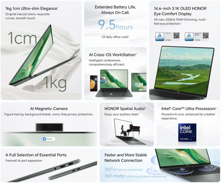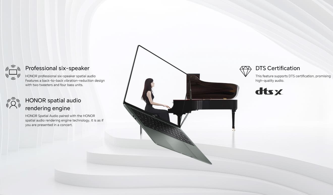 | Прочие особенности | корпус из легкосплавного магния с титановой подложкой под клавиатуру; открытие экрана на 150 градусов; сертификаты защиты зрения TÜV Rheinland Low Blue Light и Flicker Free; кнопка питания со встроенным сканером отпечатков пальцев; Honor PC Manager, Workstation, Share, Device Clone, Connect, OS Turbo, Spatial Audio, Favorites Space | |