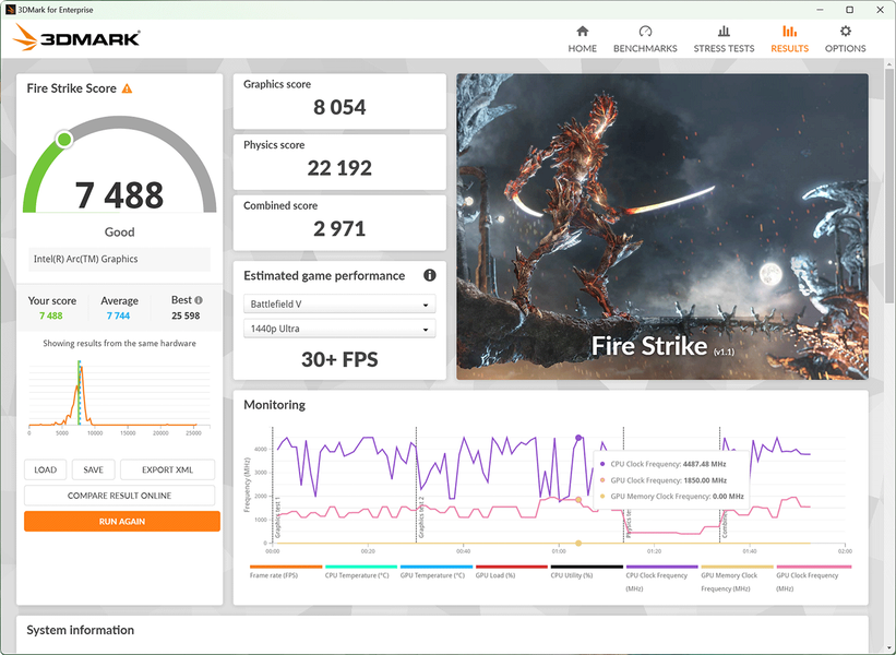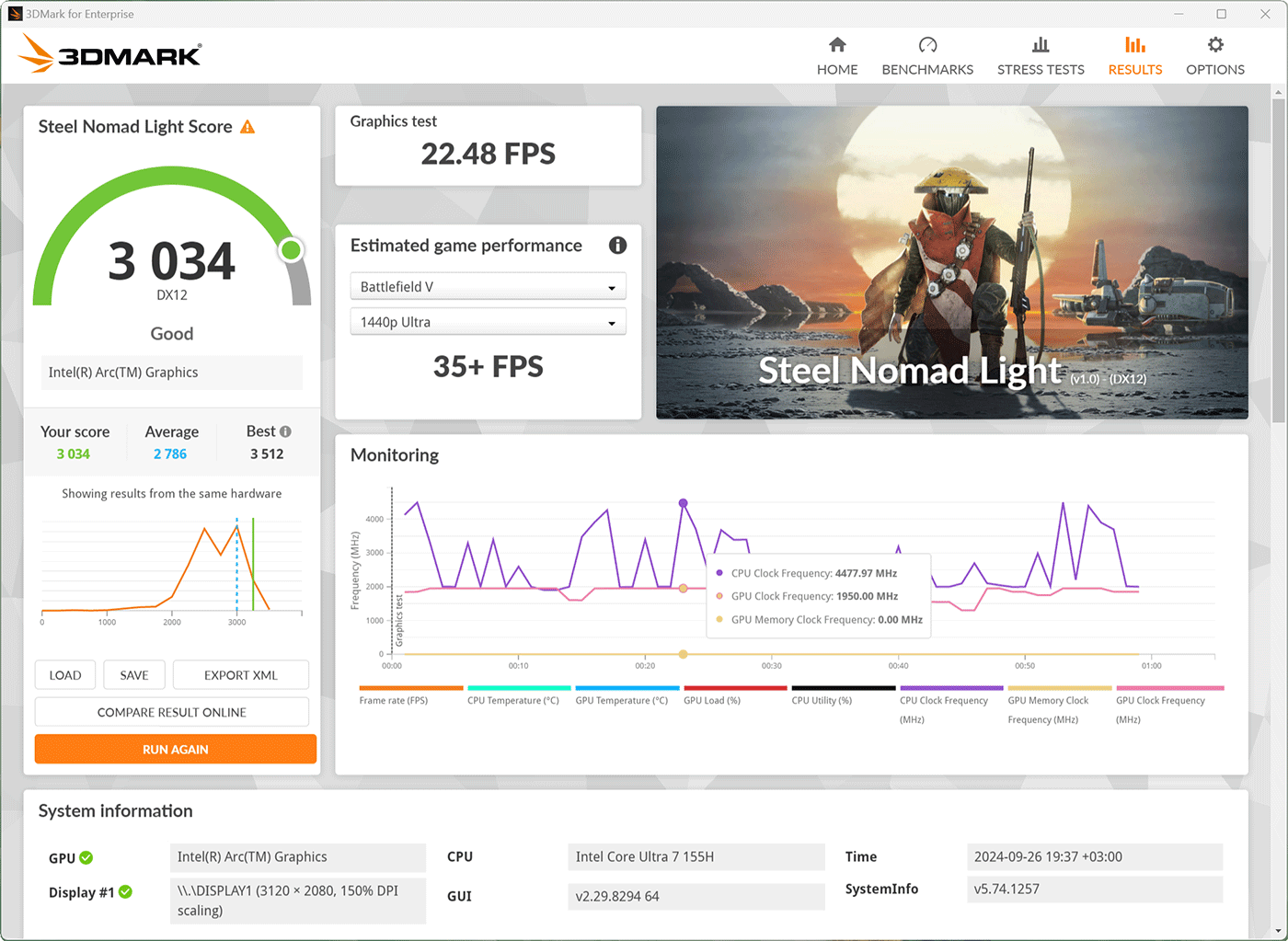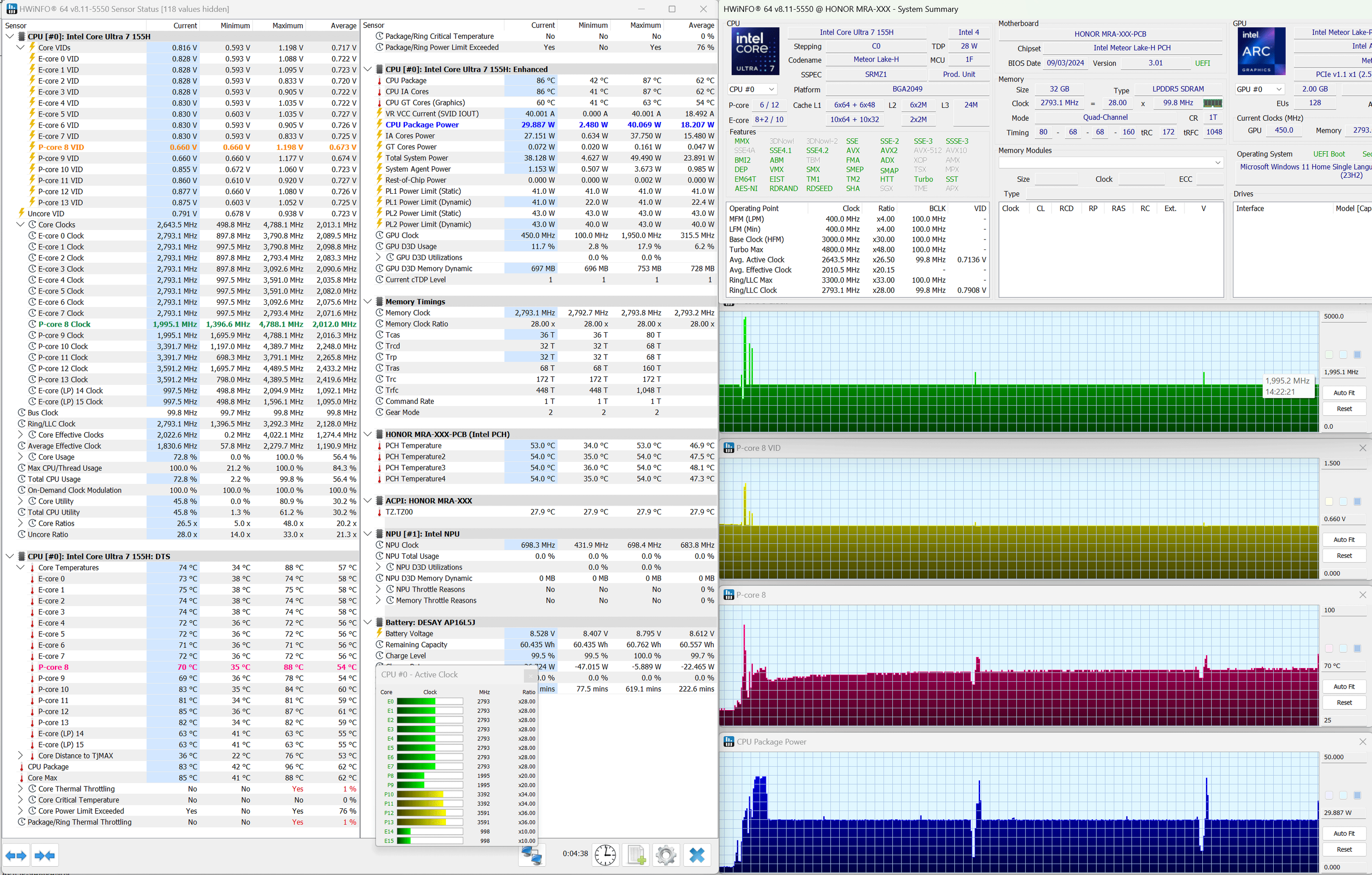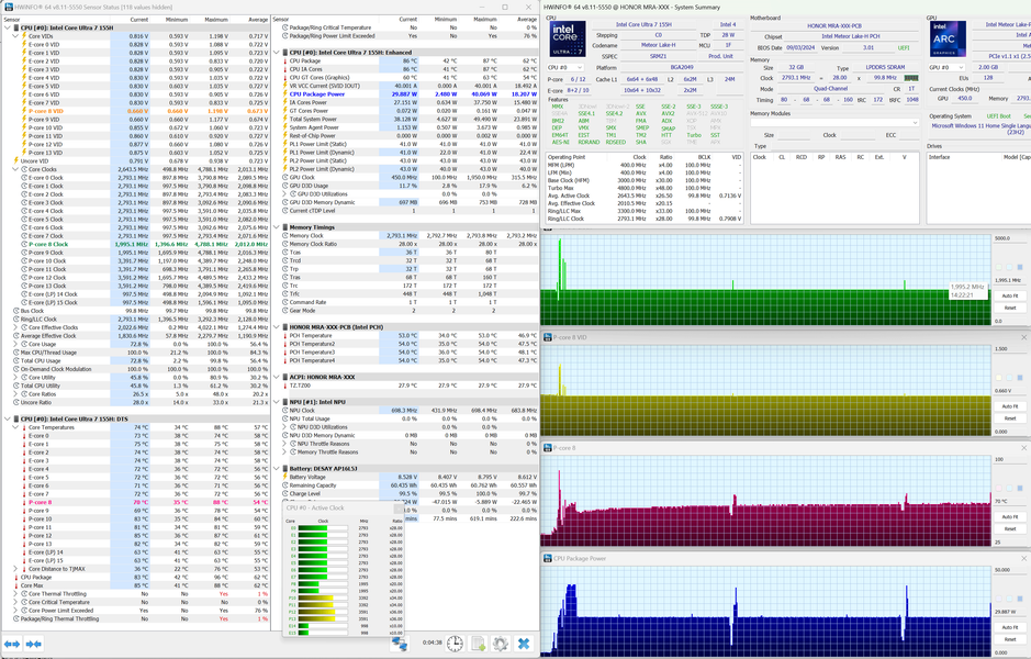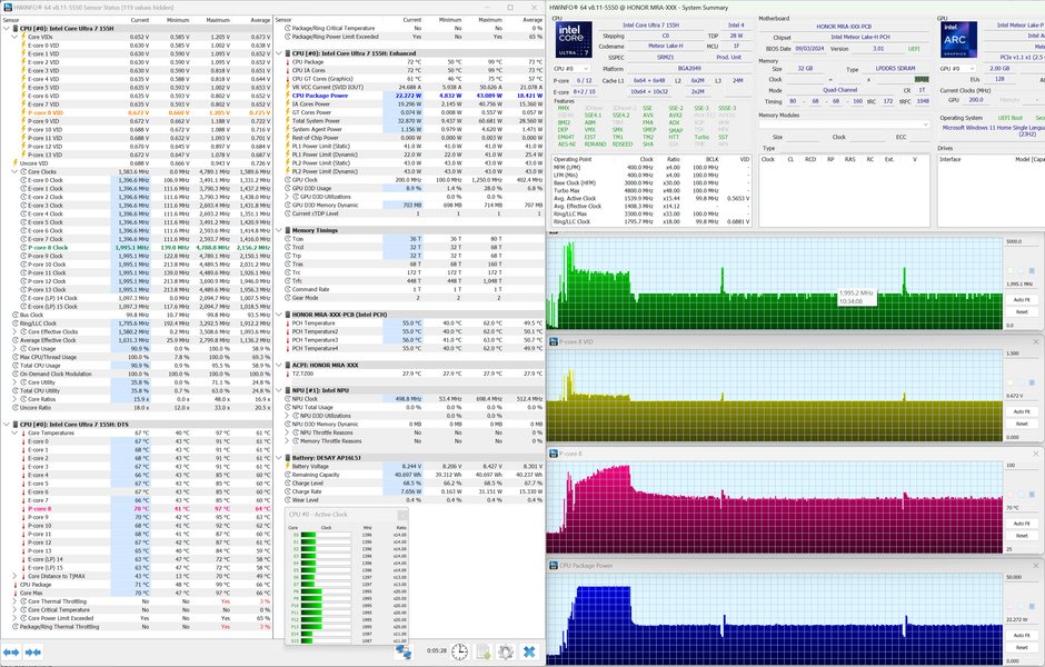 В начале теста процессор ноутбука стартует довольно бодро, пытаясь работать сначала на предельных 4,8 ГГц при 43 ваттах, затем со снижением до 3,4 ГГц и уже далее с последующей стабилизацией на 2 ГГц при 22 ваттах. Это нисколько не удивляет, никто и не ждал от Intel Core Ultra 7 155H его максимальных 60 ватт в тонком ультрабуке, тем более что в начале теста он перегревается и начинает пропускать такты буквально за одну минуту. Вентиляторы системы охлаждения изменяют свою скорость очень плавно, поэтому даже когда их становится слышно, какого-то дискомфорта не ощущается. Без стрессовой нагрузки Honor MagicBook Art 14 работает бесшумно.