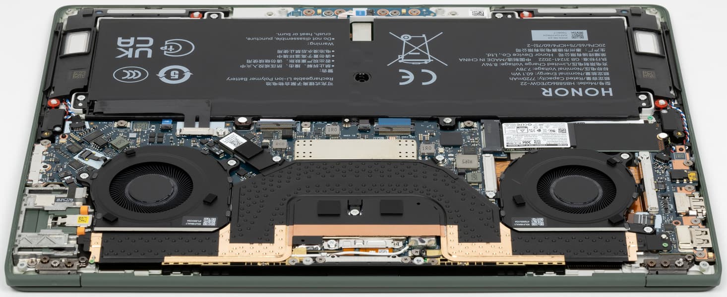 Систему охлаждения в Honor MagicBook Art 14 называют инновационной и с элементами искусственного интеллекта. На самом деле решить вопрос охлаждения центрального процессора и сопутствующих ему элементов в столь тонком корпусе — задача не тривиальная. Тем не менее, в Honor с ней успешно справились.