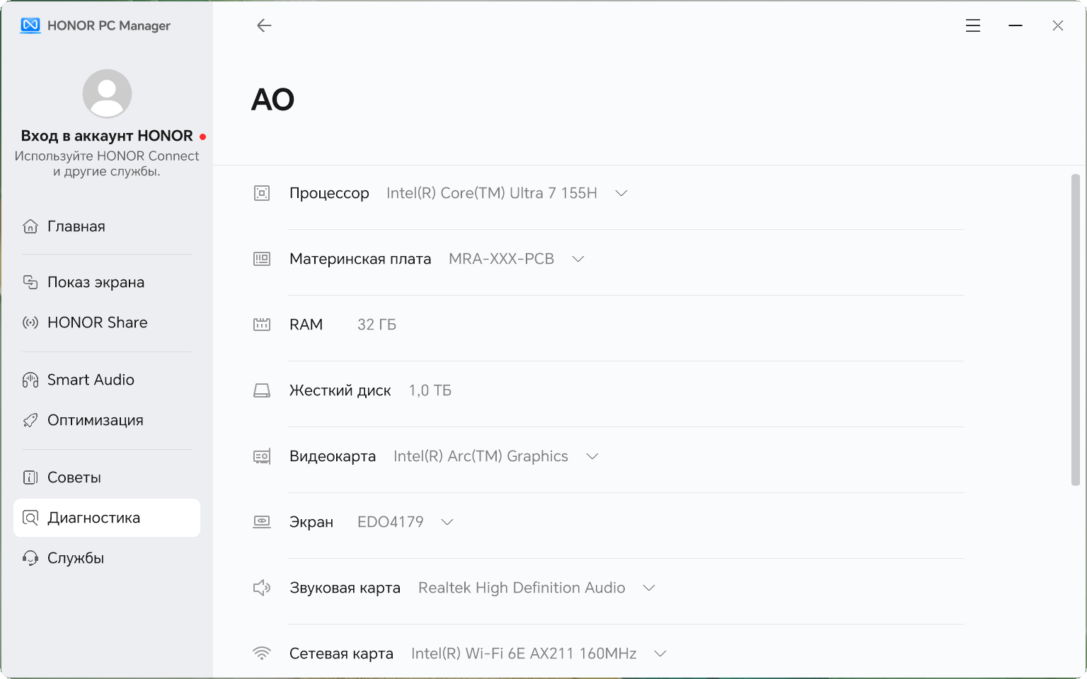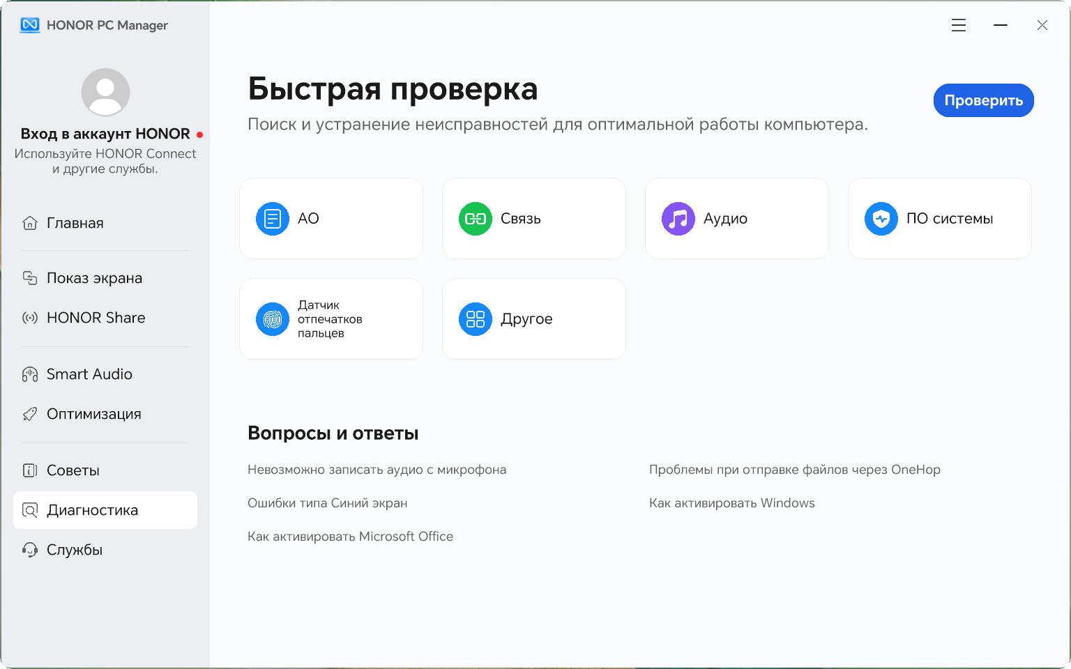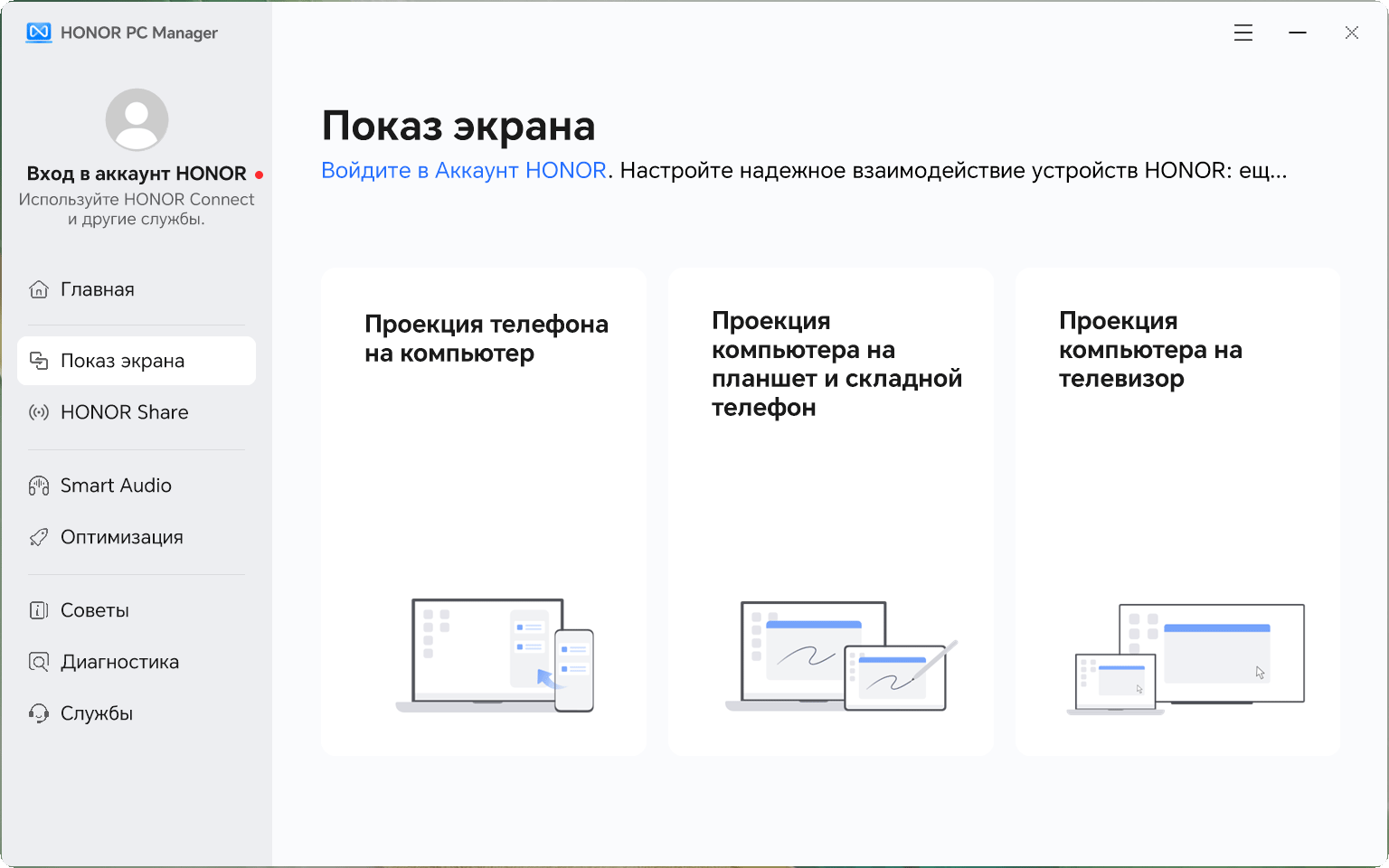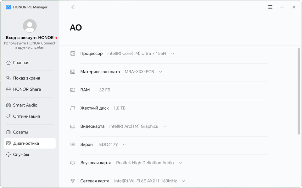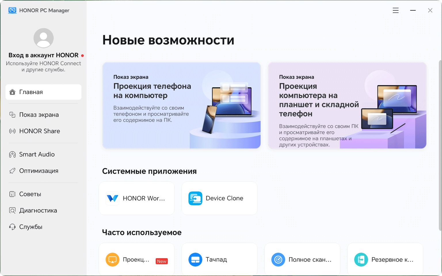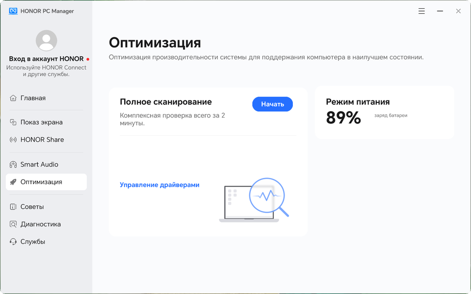 Дополнительные возможности ультрабука по обмену данными или взаимодействию с другими устройствами реализованы в утилите Honor PC Manager.
