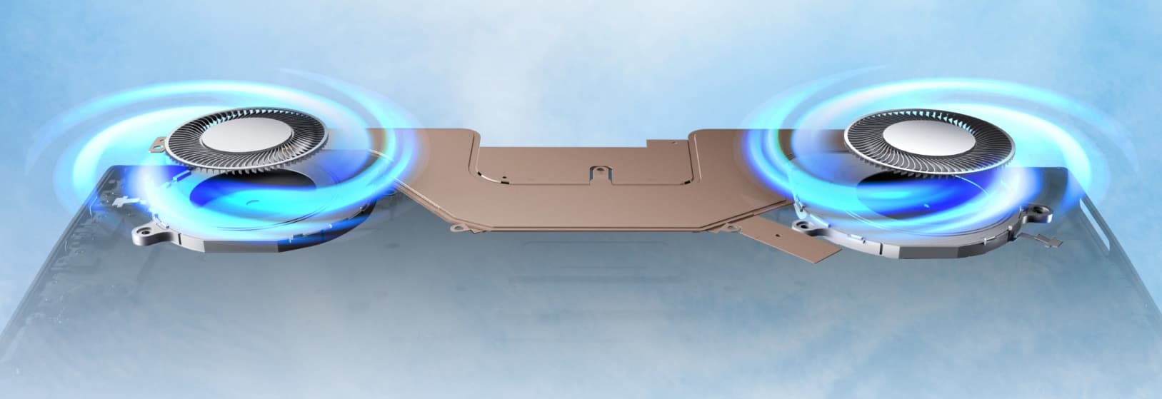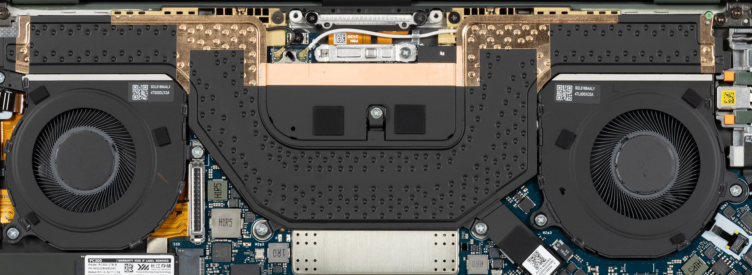 Заявлено, что в конструкции системы охлаждения используется теплопроводящий графит (где именно, не уточняется). На фото ниже видно, что в кулере есть испарительная камера большой площади с плавным переходом на радиаторы, установленные в заднем торце корпуса. Охлаждают их два вентилятора с лопастями из высокопрочного полимера.