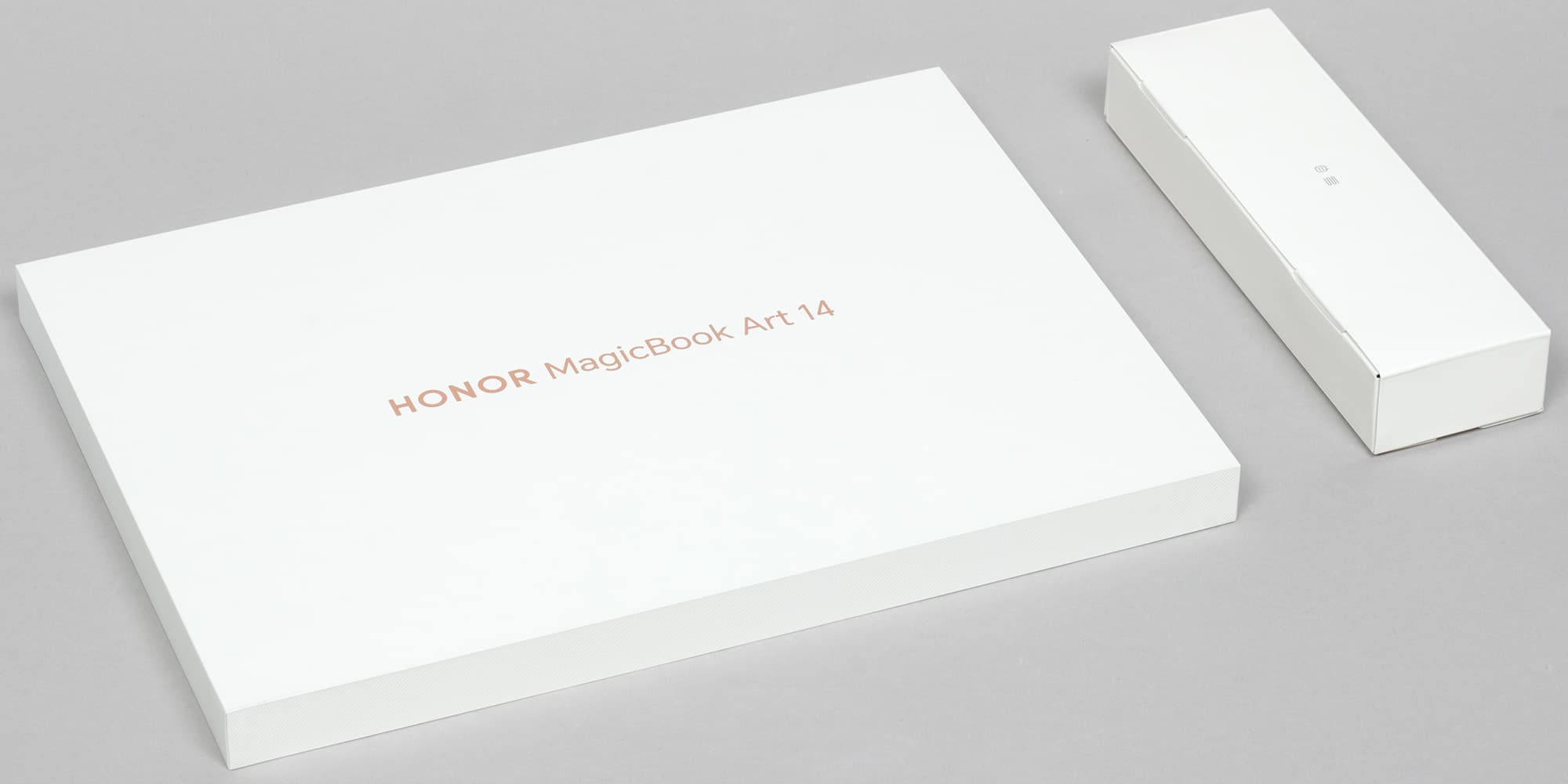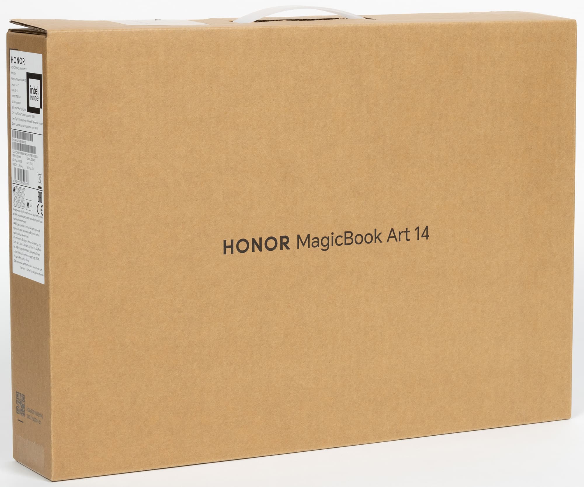 Краткую конфигурацию Honor MagicBook Art 14 и служебную информацию можно найти на стикере с торца коробки. Внутри ультрабук зажат между двух вставок из вспененного полиэтилена и вложен в еще одну плоскую коробку с золотистой надписью в центре.