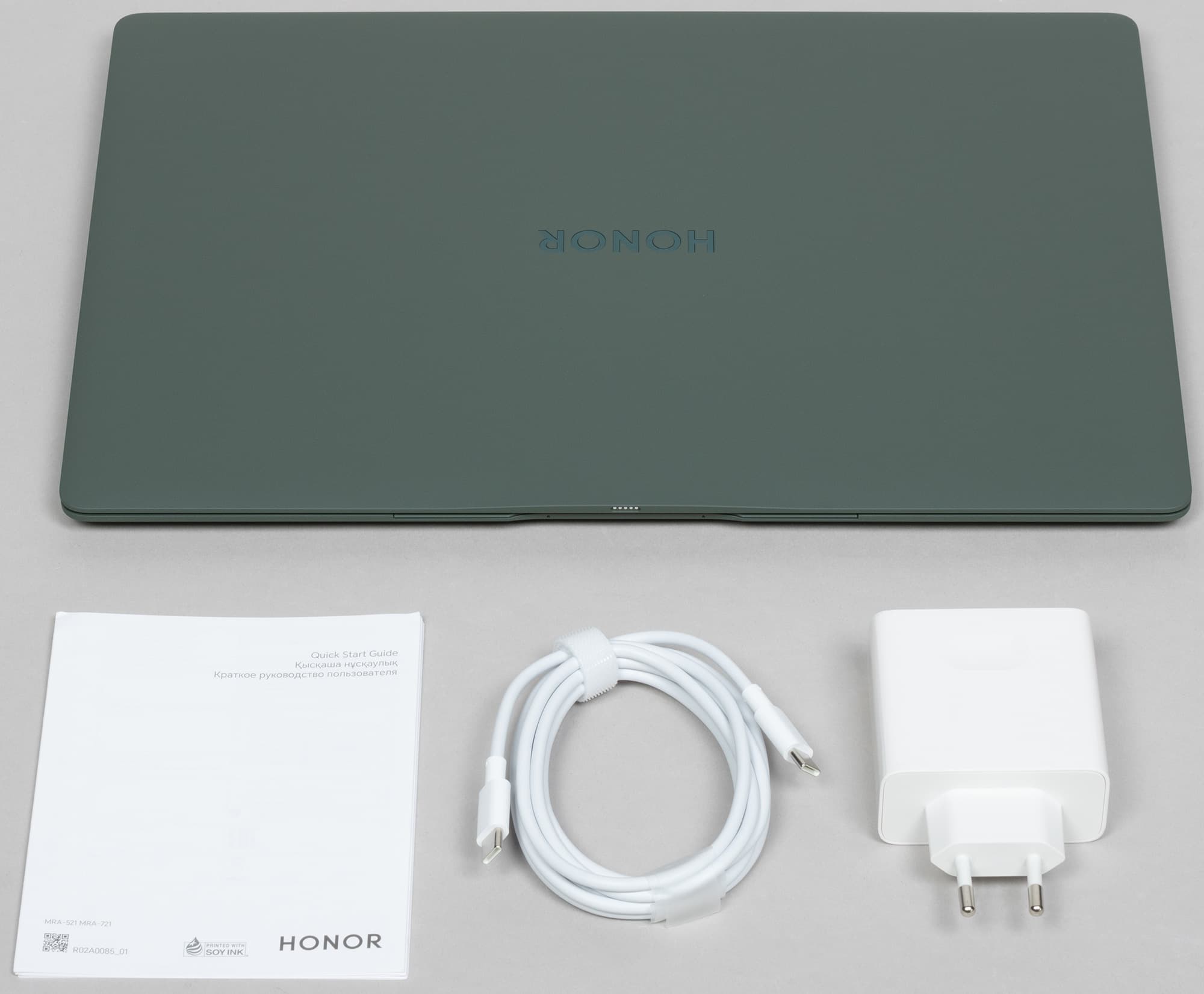 С одного торца этой упаковки вставлена коробка с адаптером питания и кабелем USB Type-C. Кроме них в комплекте поставки можно найти краткое руководство пользователя.