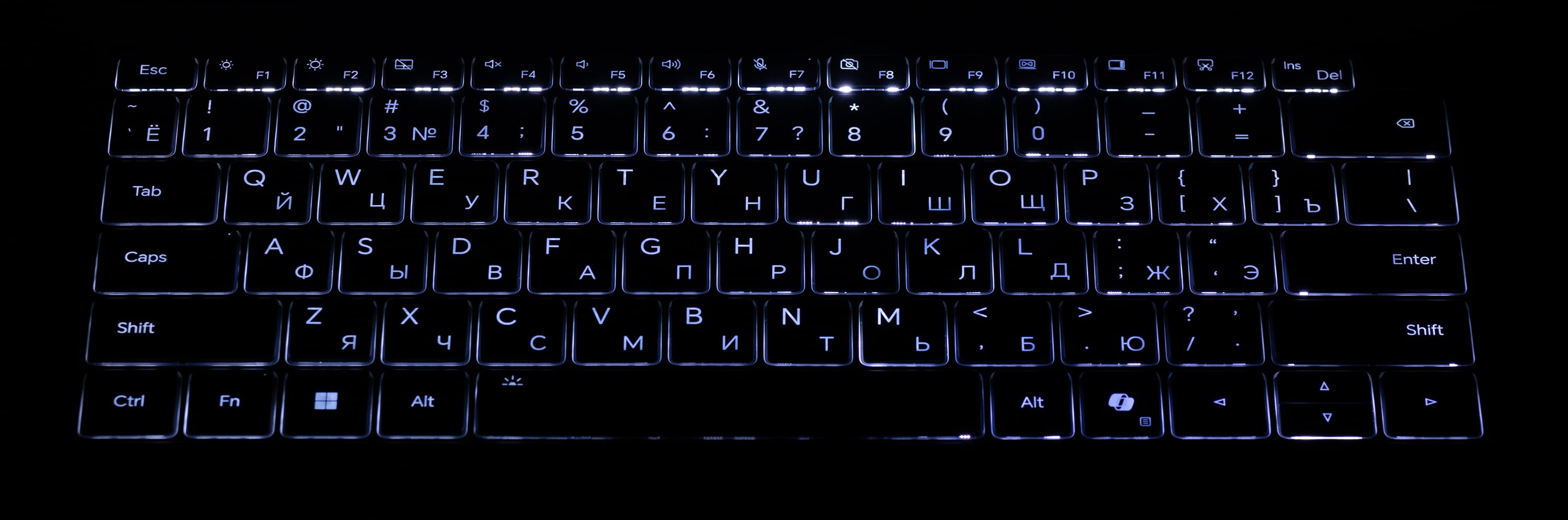 Белая подсветка клавиатуры, регулируемая в двух уровнях, позволит работать или развлекаться по ночам. Равномерность подсветки вопросов не вызывает.