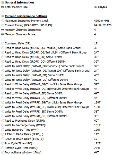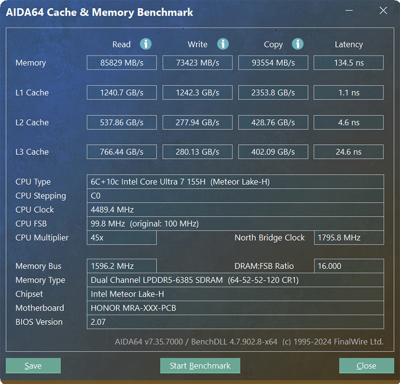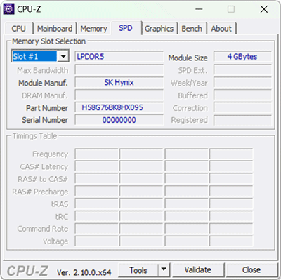 | Оперативная память | 32 ГБ LPDDR5X-7467 (распаяна на плате), четырехканальный режим (соответствует двухканальному режиму DDR4), тайминги 64-52-52-120 CR1 | |