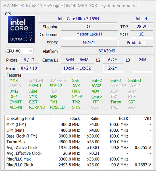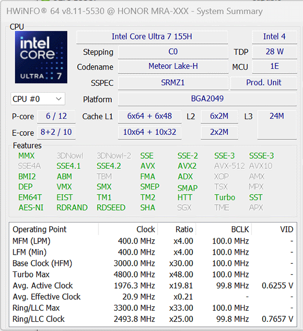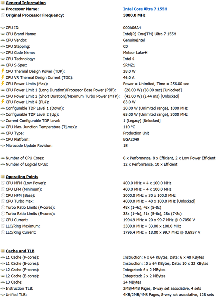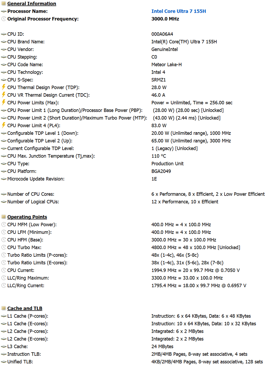 | Процессор | Intel Core Ultra 7 155H (Intel 4, Meteor Lake-H, 6 P-ядер/12 потоков + 10 E-ядер, до 4,8 ГГц, L3-кэш 24 МБ, TDP 28—65 Вт); доступна версия с процессором Intel Core Ultra 5 125H | |