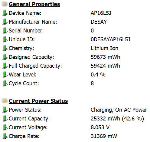 По данным диагностических утилит фактическая емкость оказалась чуть меньше и равна 59,67 Вт·ч.