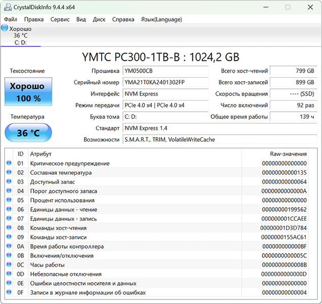 | Накопитель | 1×SSD 1 ТБ (YMTC PC300-1TB-B), M.2 2280, PCIe 4.0 x4 | |