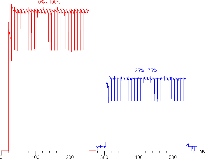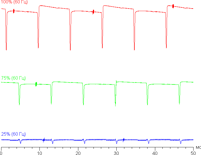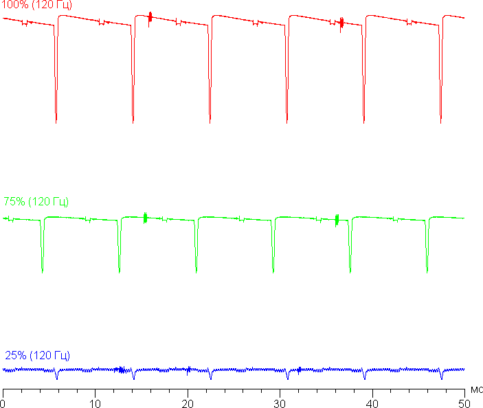 На любом уровне яркости присутствует значимая модуляция с частотой 120 Гц. На рисунках ниже приведены зависимости яркости (вертикальная ось) от времени (горизонтальная ось) для нескольких значений настройки яркости (для режима с частотой обновления 120 Гц; зависимость реальной яркости от %% шкалы очень нелинейная):