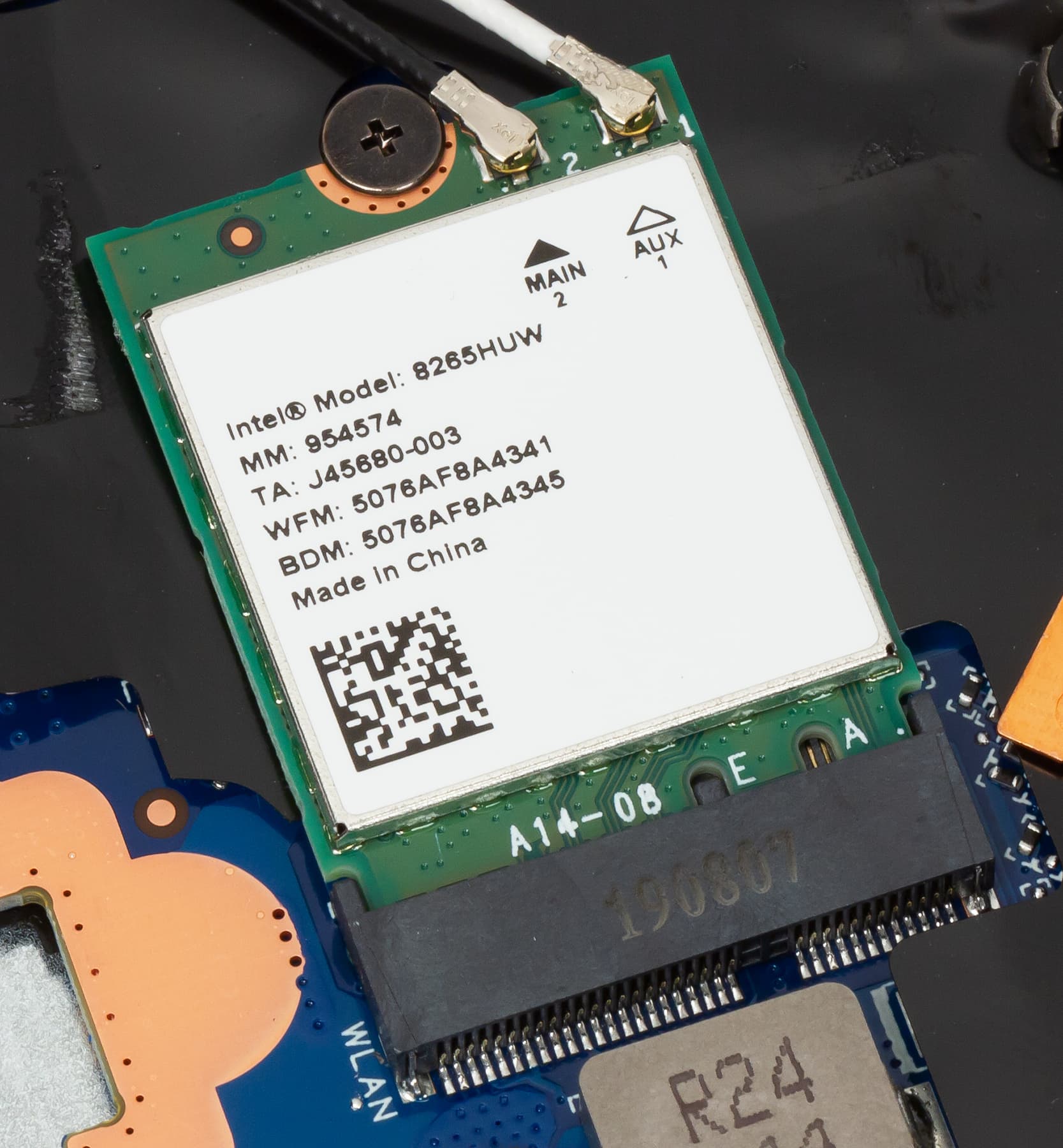 Коммуникационные возможности ноутбука определяются наличием беспроводного сетевого адаптера Intel Wireless-AC 8265 (M.2 2230). Этот двухантенный модуль поддерживает частотные диапазоны 2,4 и 5 ГГц, соответствует спецификациям IEEE 802.11b/g/n/ac и Bluetooth 4.2.