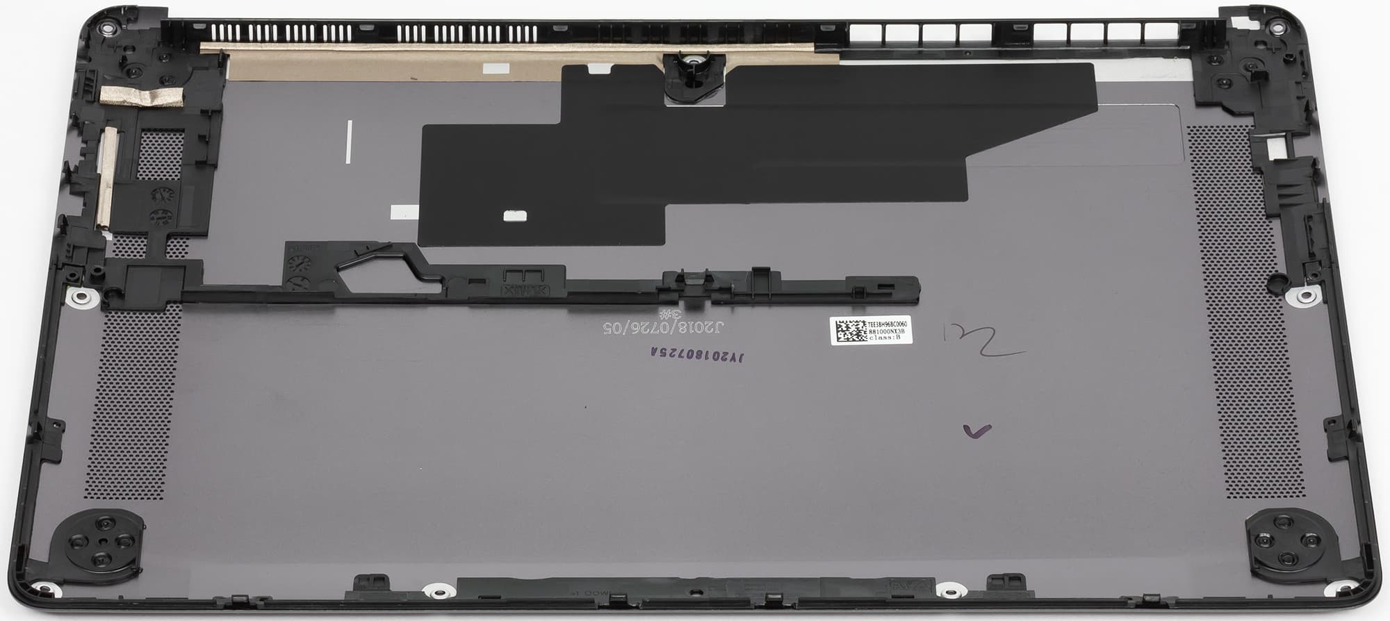 Нижняя панель корпуса точно такая же по цвету и текстуре, как и крышка. На этой панели, закругленной к краям, есть вентиляционные отверстия и резиновые вставки-ножки.