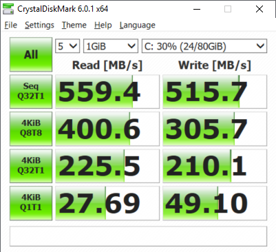 Утилита CrystalDiskMark 6.0.1 демонстрирует примерно аналогичные результаты.