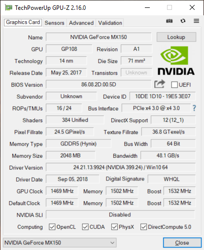 Базовая частота графического процессора Nvidia GeForce MX150 составляет 1469 МГц, а в режиме GPU Boost может достигать 1532 МГц. .