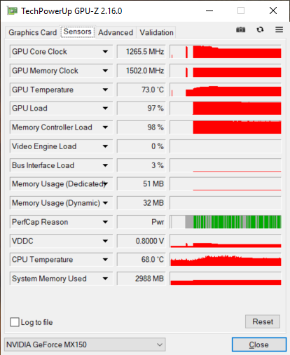 Как выяснилось в ходе тестирования, в режиме стрессовой загрузки (FurMark) видеокарты Nvidia GeForce MX150 в установившемся режиме частота GPU составляет 1265 МГц, а частота памяти GDDR5 составляет 1502 МГц (эффективная частота 6 ГГц).