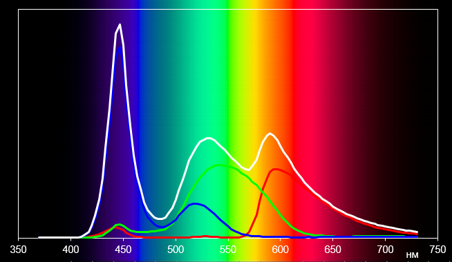 Светофильтры ЖК-матрицы не очень хорошо изолируют основные цвета, что типично для таких экранов. Спектры зеленого и красного, а также зеленого и синего цветов перекрываются.