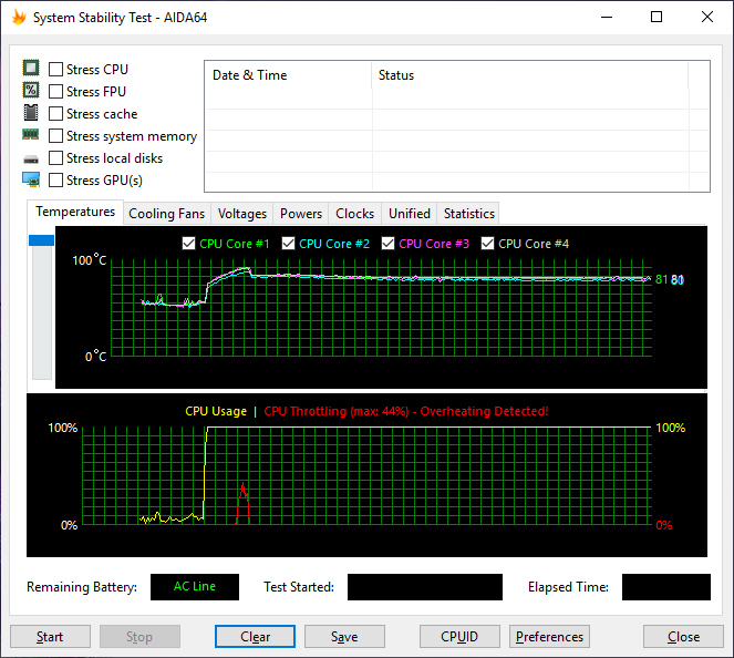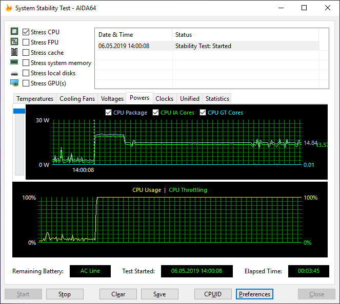 Как мы уже отмечали, ноутбук Honor MagicBook Intel (VLT-W50) оснащен четырехъядерным процессором Intel Core i5-8250U. Чтобы оценить эффективность охлаждения процессора, мы провели анализ работы в различных режимах нагрузки. Для загрузки процессора использовались утилиты AIDA64 и Prime95 (тест Small FFT), а мониторинг осуществлялся с помощью утилит AIDA64 и CPU-Z.