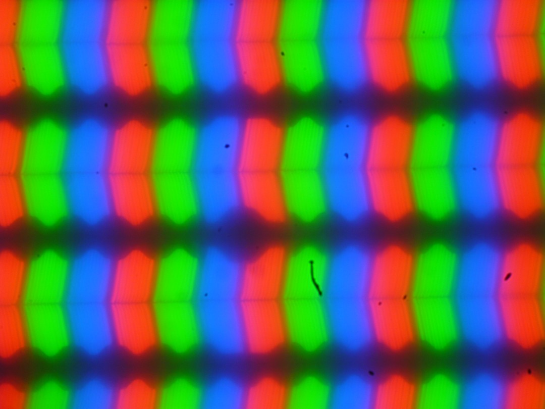 В этом ноутбуке используется матрица типа IPS. Микрофотографии демонстрируют типичную для IPS структуру субпикселей (черные точки — это пыль на матрице фотоаппарата):