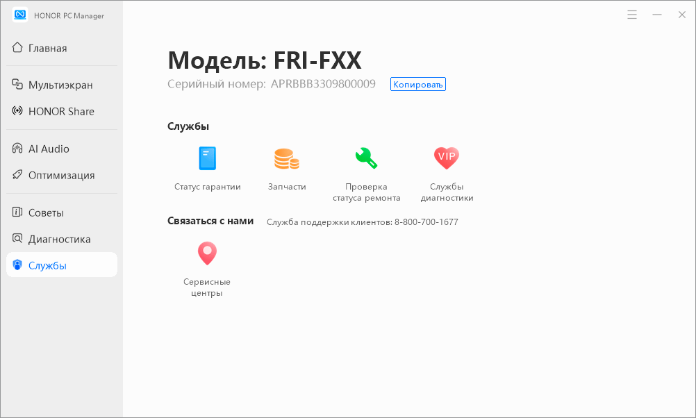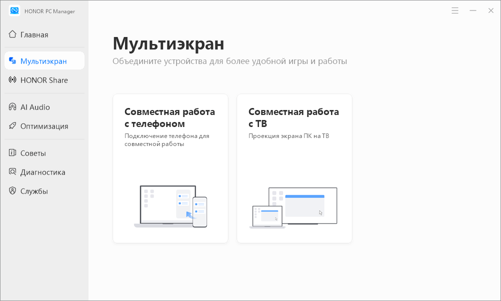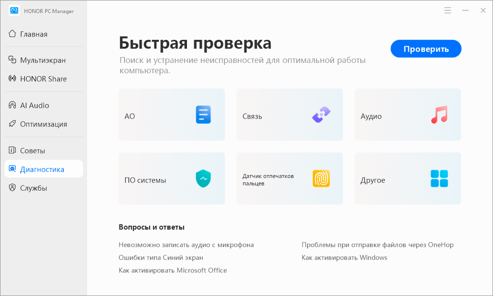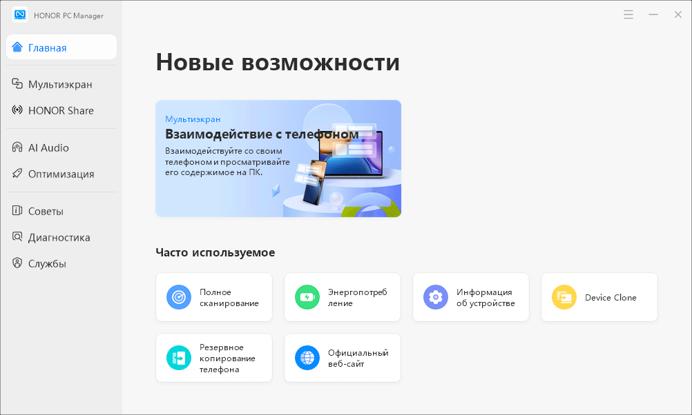 С операционной системой ноутбука Windows 11 Home установлена фирменная утилита Honor PC Manager. Она не только предоставляет пользователю всю необходимую информацию об устройстве и позволяет оперативно обновить его или обслужить, но и поможет интегрировать Honor MagicBook X 14 2023 со смартфоном или планшетом.