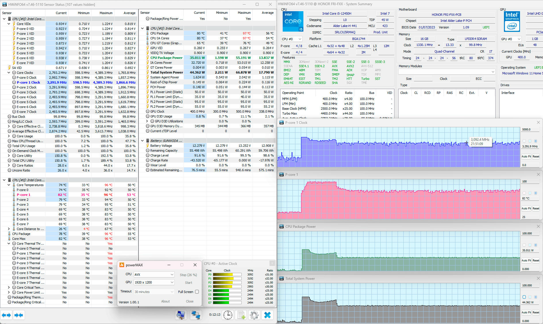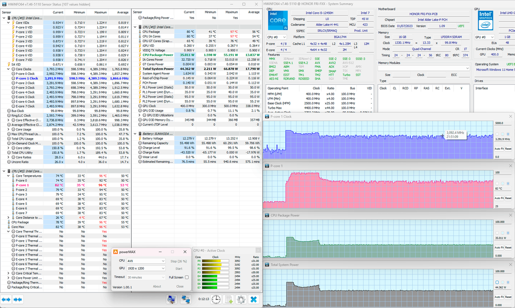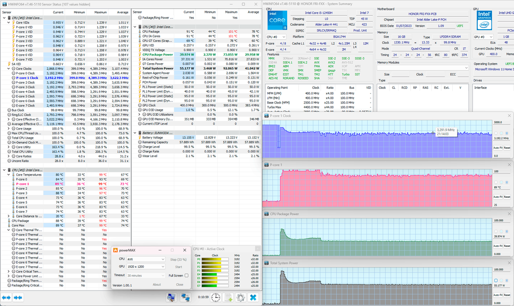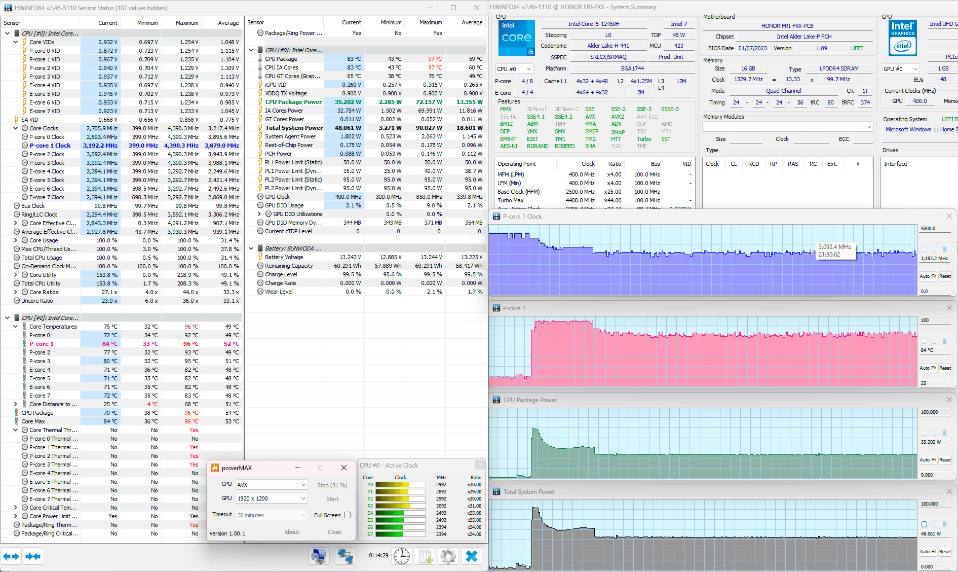 Honor MagicBook X 14 2023 был протестирован в стресс-тесте в двух режимах с помощью программы powerMax (с использованием AVX-инструкций). За мониторинг отвечала программа HWinfo64. Результаты теста ноутбука при питании от электросети приведем на двух скриншотах.