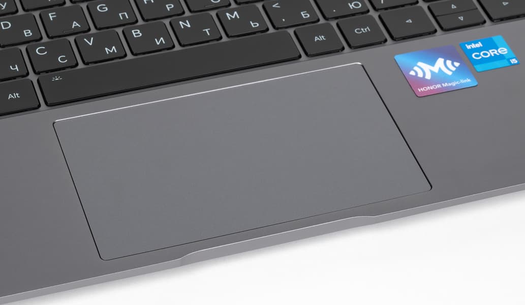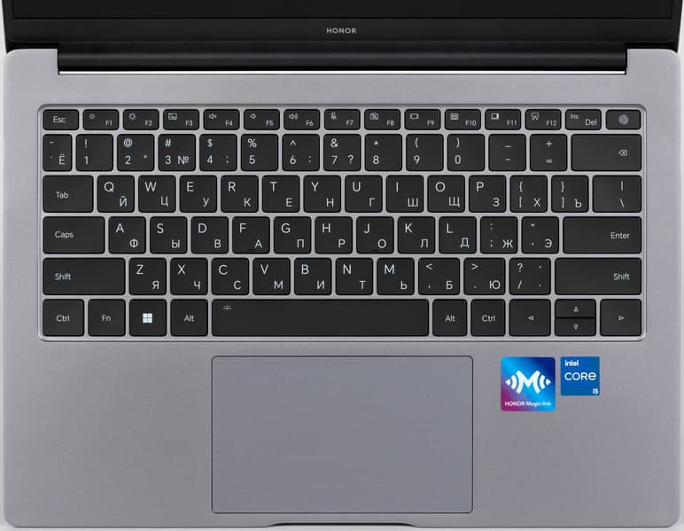 MagicBook X 14 2023 наделен стандартной для данного класса ноутбуков Honor клавиатурой мембранного типа. Она не меняется несколько поколений, не считая совсем уж незначительных деталей. Из изменений модели 2023 года выделим перенос камеры из центральной функциональной кнопки в верхнюю панель (это плюс) и размещение кнопки включения ноутбука в правом верхнем углу панели клавиатуры (это минус).