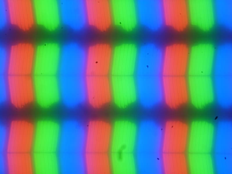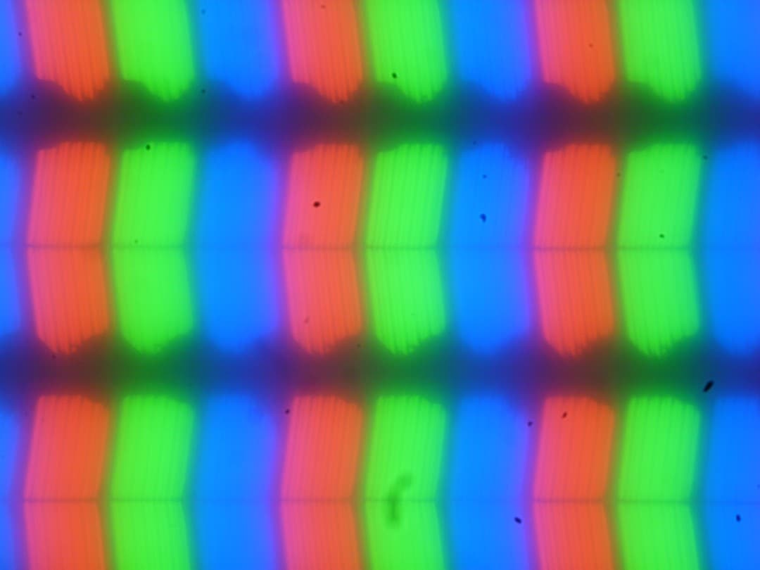 В этом ноутбуке используется матрица типа IPS. Микрофотографии демонстрируют типичную для IPS структуру субпикселей (черные точки — это пыль на матрице фотоаппарата):