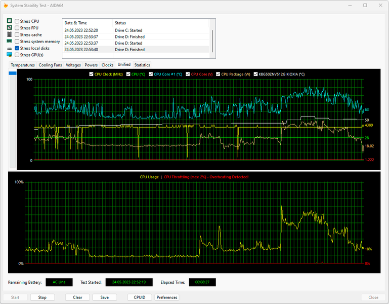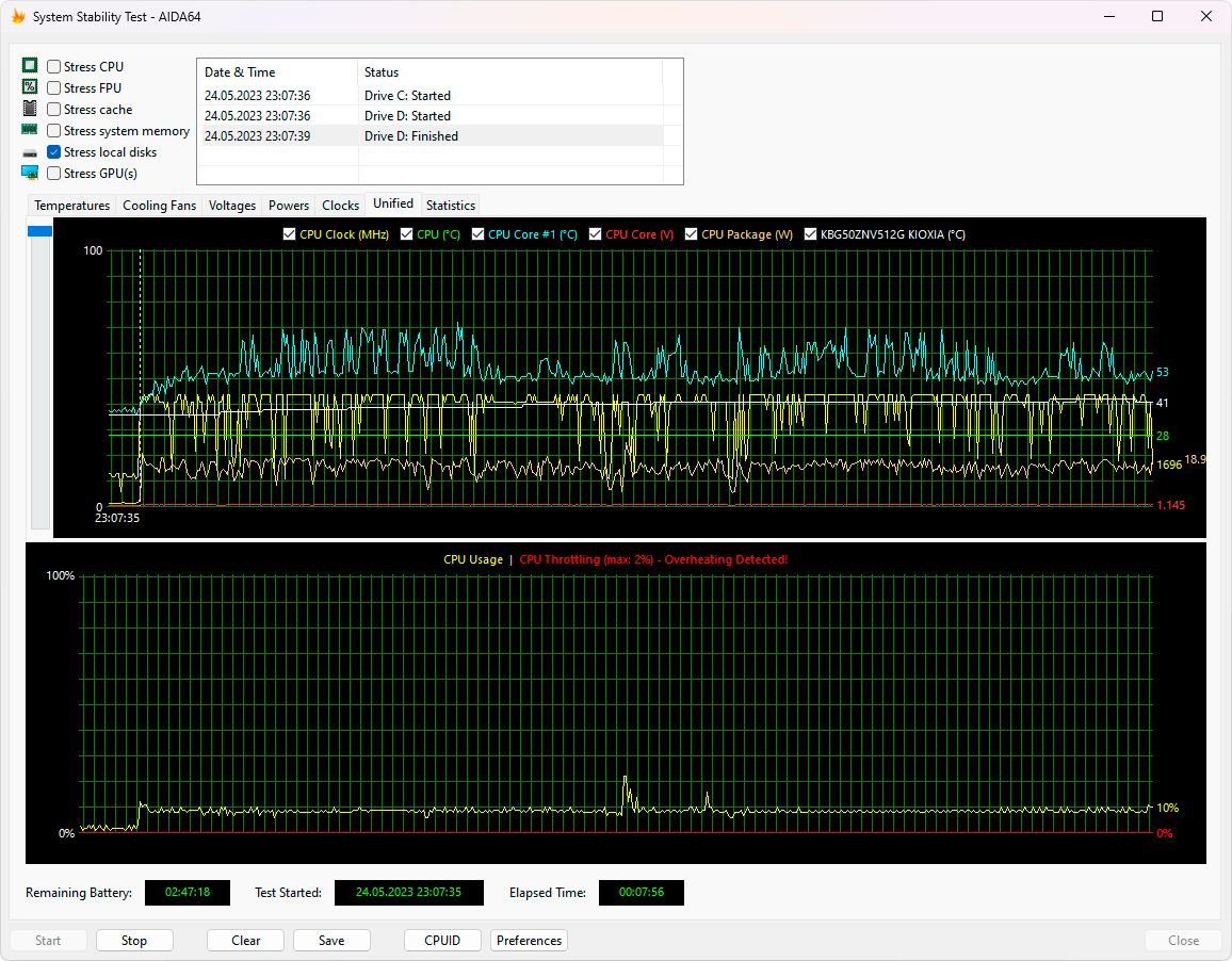 Если ноутбук подключен к активному адаптеру питания и работает в производительном режиме, то накопитель прогревается до 53 °C, тогда как при работе от аккумулятора температуры SSD не превышают отметку 42 °C. В обоих случаях поводов для беспокойства за повреждение данных на SSD от перегрева бессмысленно. Тем более, что в повседневной работе за ноутбуком температура SSD выше 40 °C не поднимается.