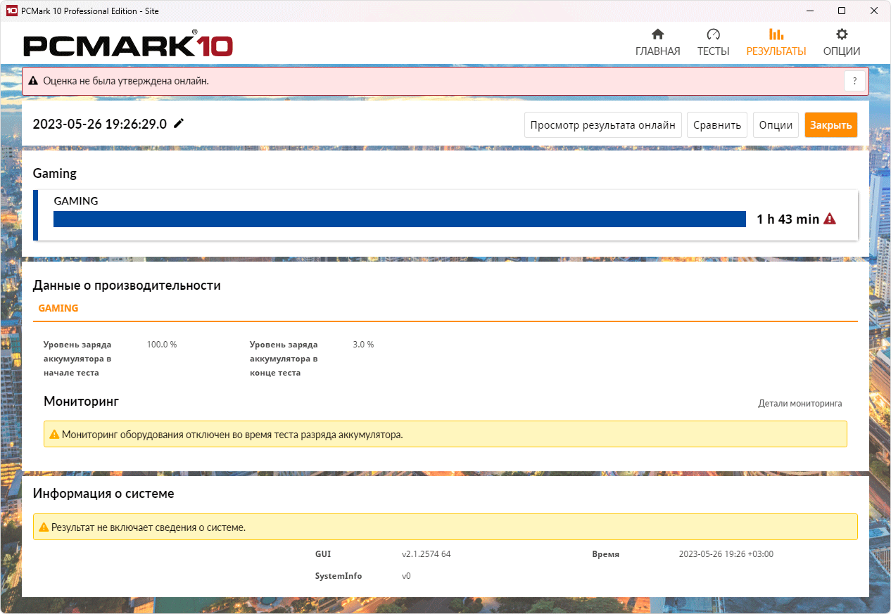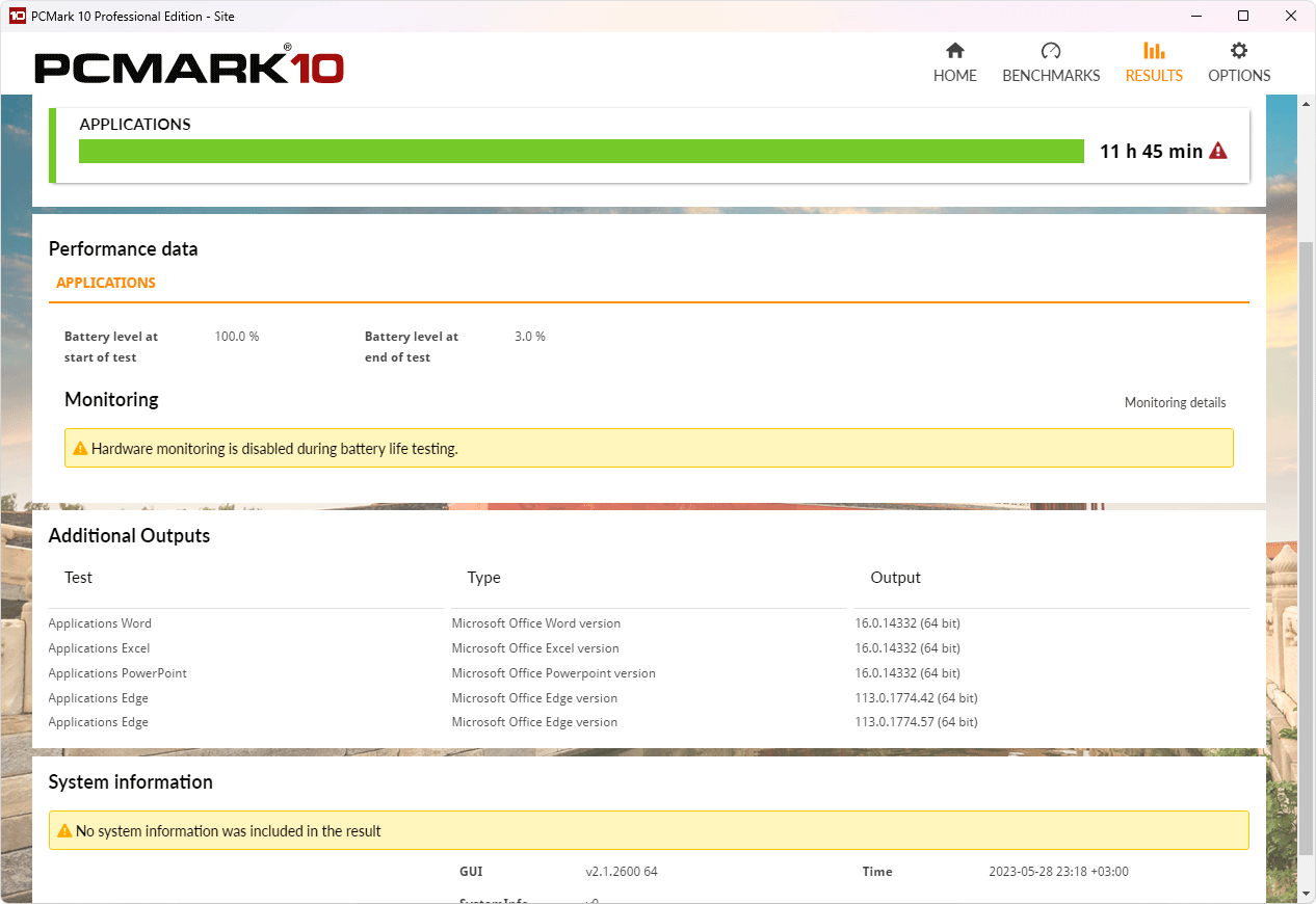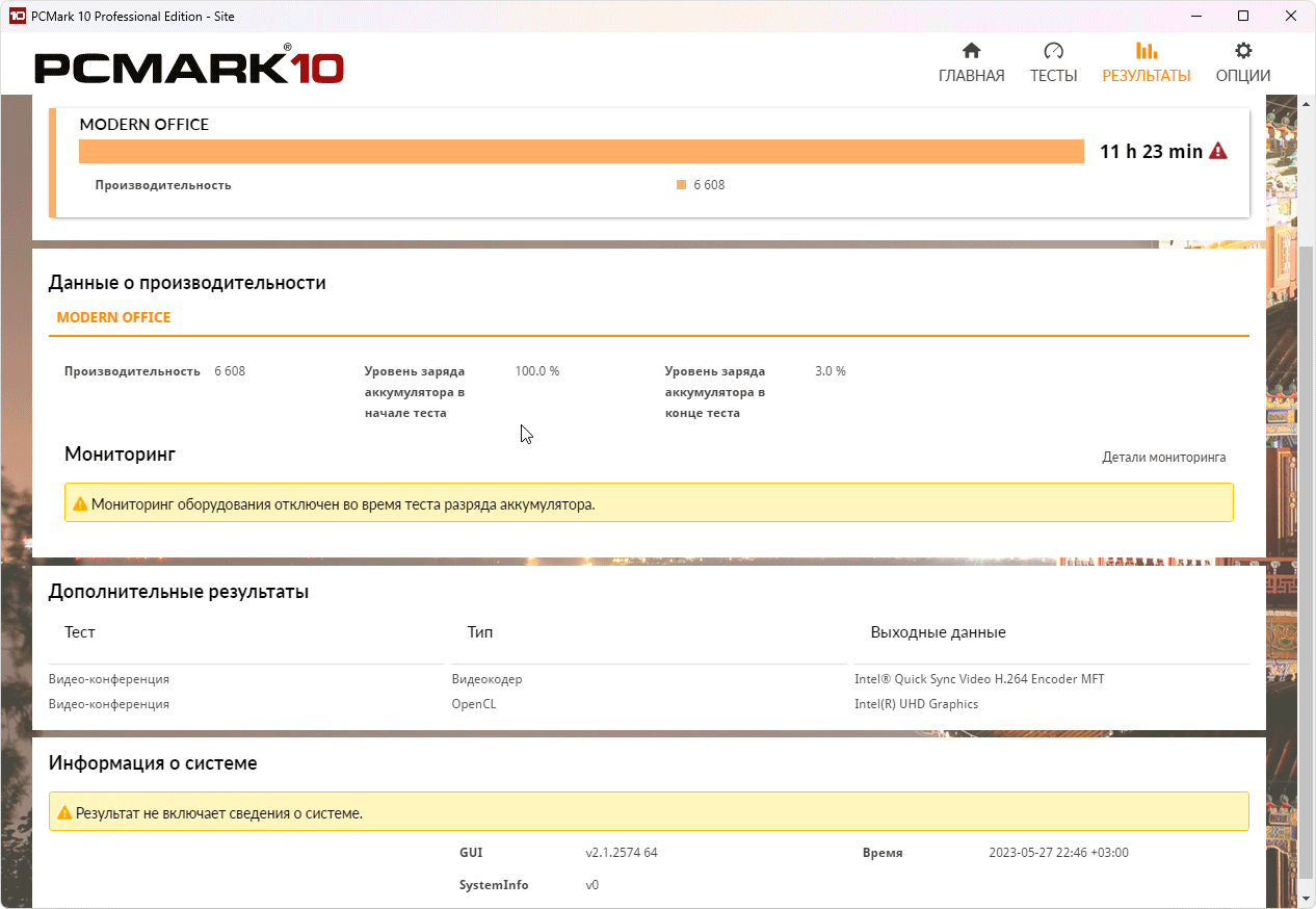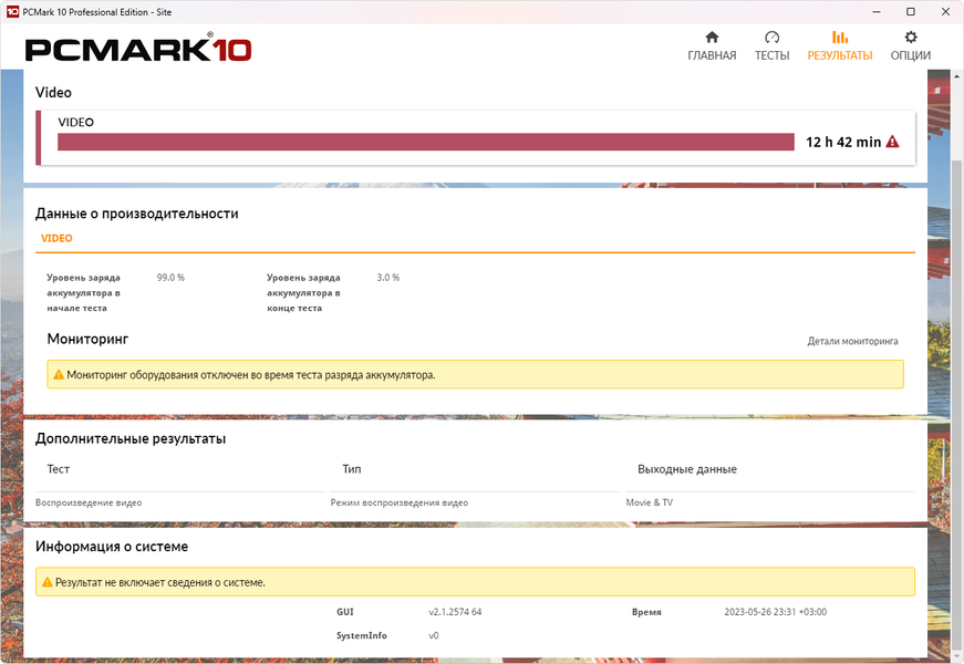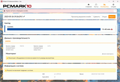 Кроме этого, мы провели дополнительные тесты автономности с помощью пакета PCMark’10 в четырех режимах. Сетевые соединения и звук не отключались, а также не вводилось никаких искусственных оптимизаций. Результаты приведены далее на четырех скриншотах.