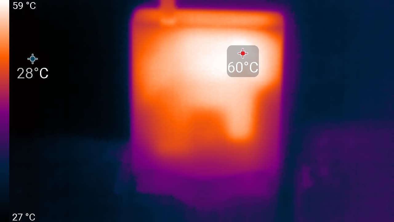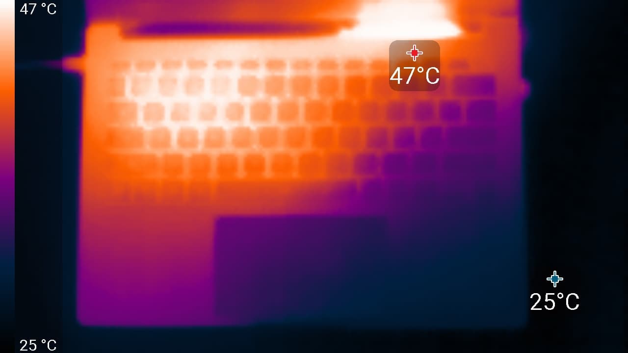 Под максимальной нагрузкой работать с клавиатурой не комфортно, так как место под левым запястьем существенно нагревается. Ноутбук держать на коленях также неприятно, так как колени соприкасаются с областями высокого нагрева, также колени частично перекрывают вентиляционную решетку, что увеличивает шум и может вызвать перегрев ноутбука. Блок питания греется очень сильно, поэтому необходимо чтобы при долговременной работе с большой производительностью он не был чем-то накрыт.