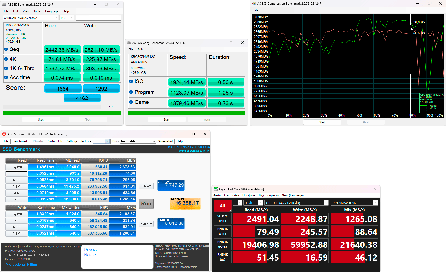 Заявленная скорость чтения SSD составляет 3500 МБ/с, записи — 2700 МБ/с, число операций ввода-вывода заявлено на отметках 400000 IOPS для чтения и 430000 IOPS для записи.