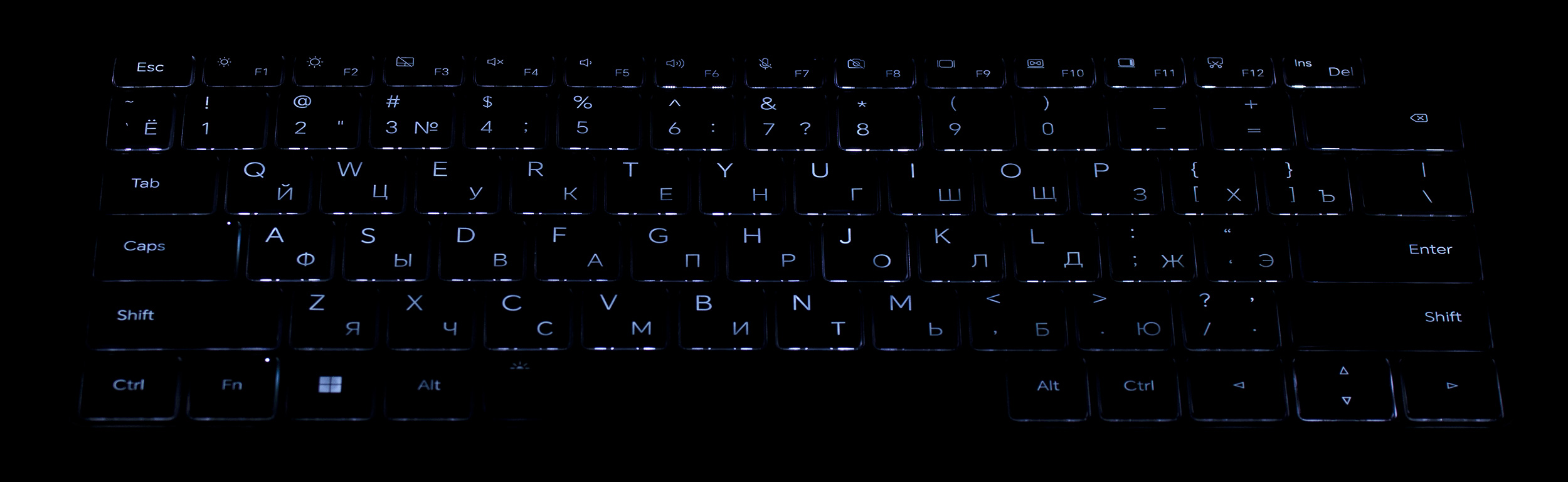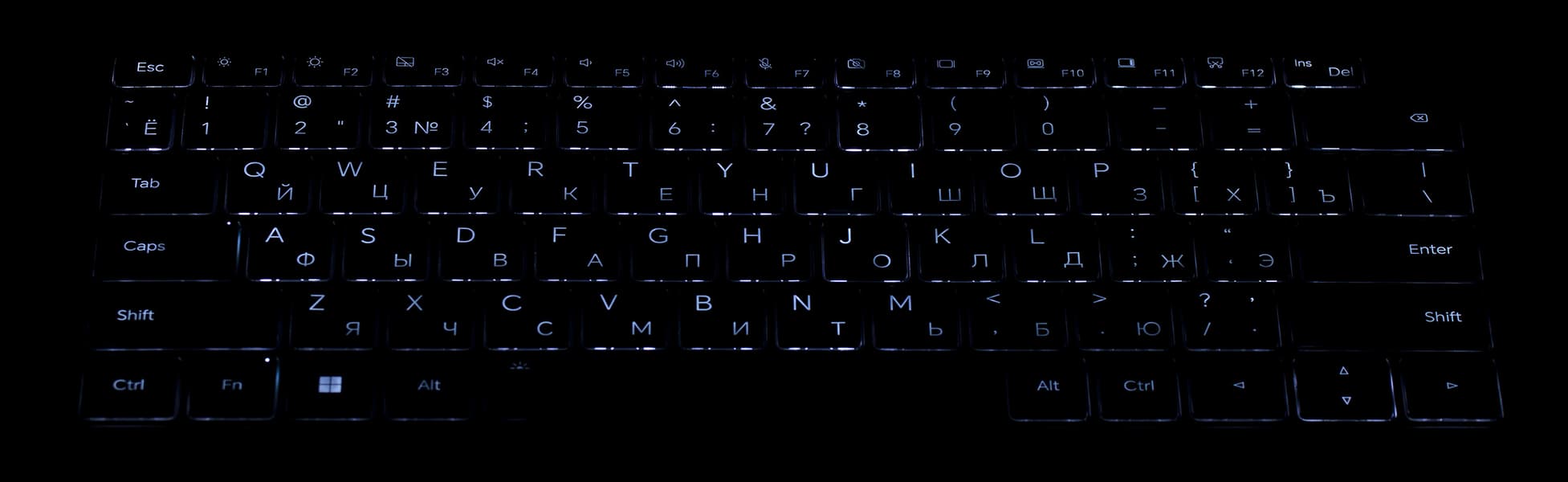 Отключаемая двухуровневая подсветка клавиатуры поможет работать в темное время суток, но равномерность подсветки оставляет желать лучшего.