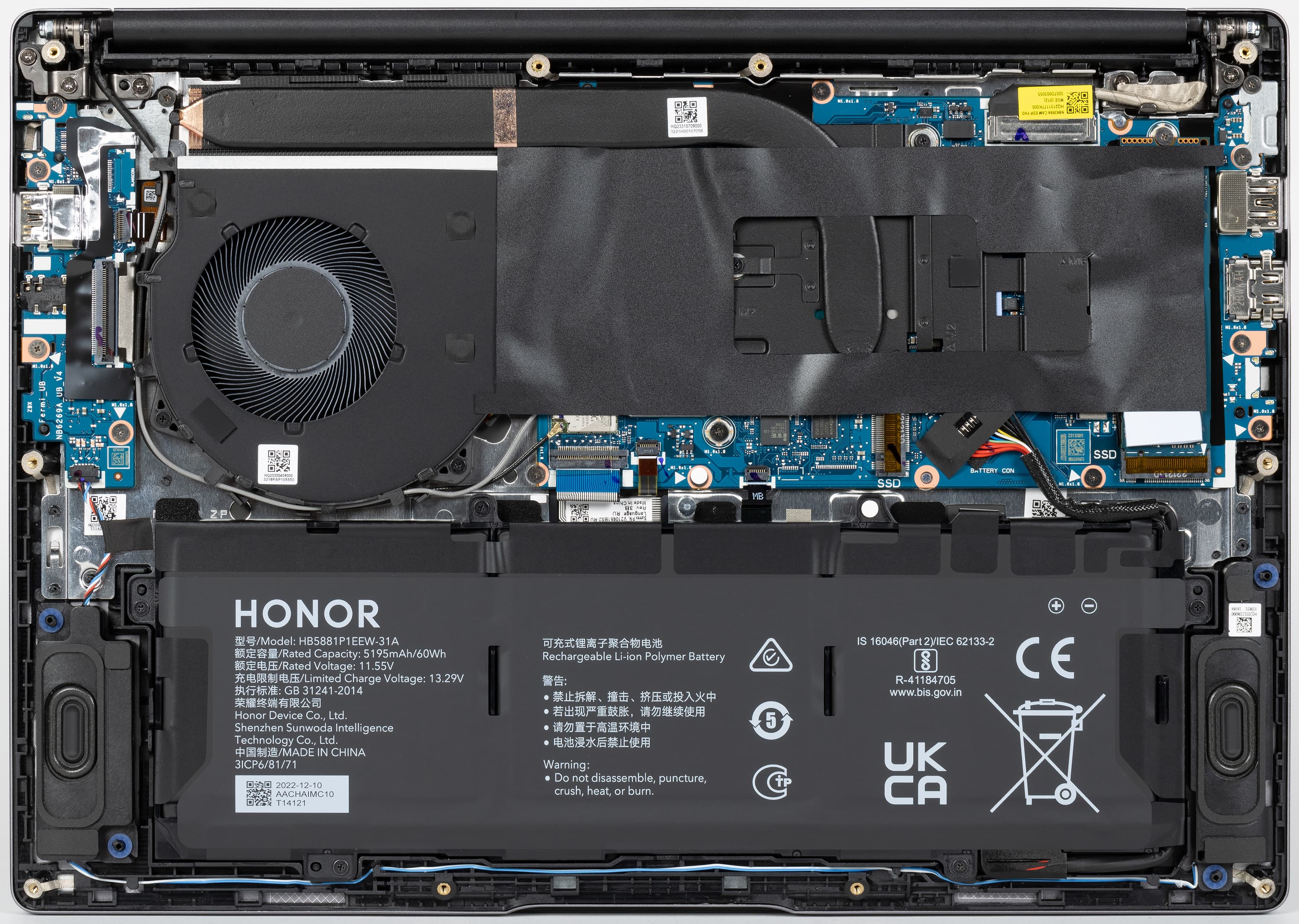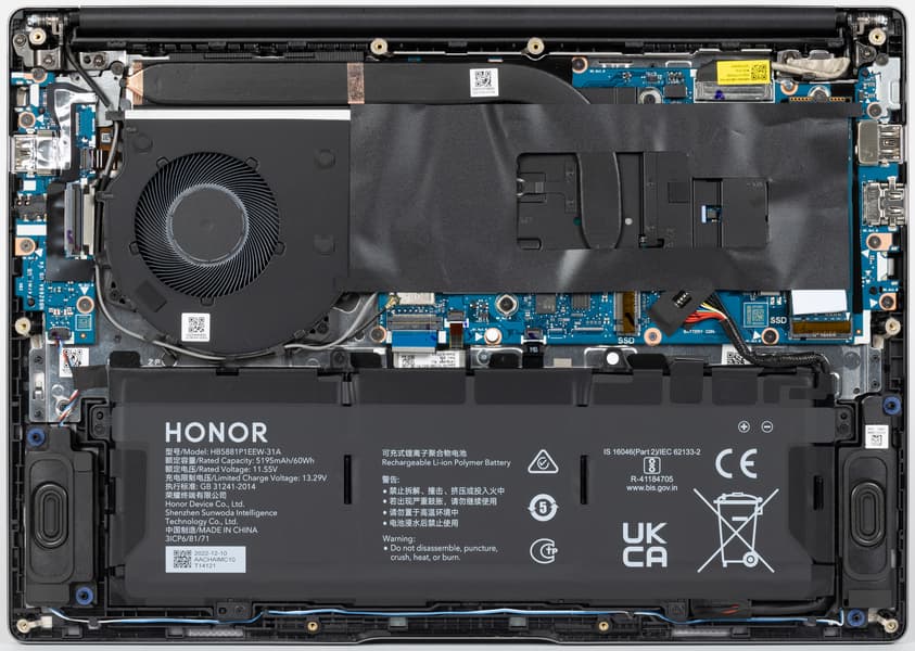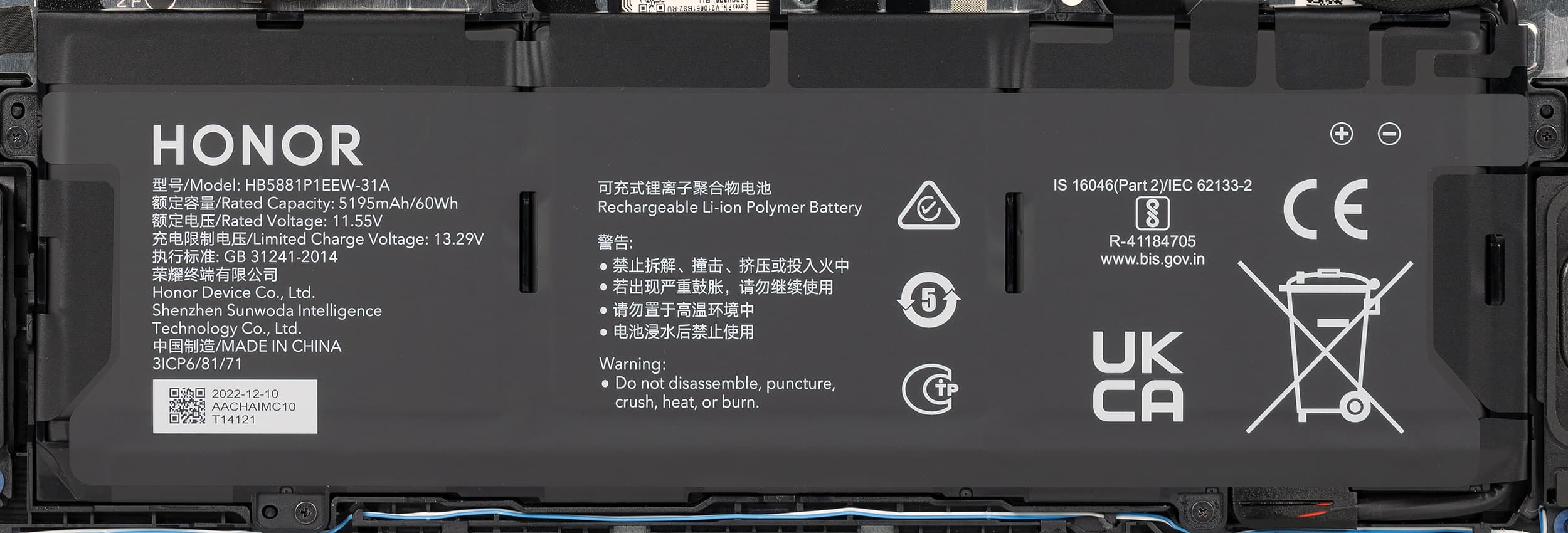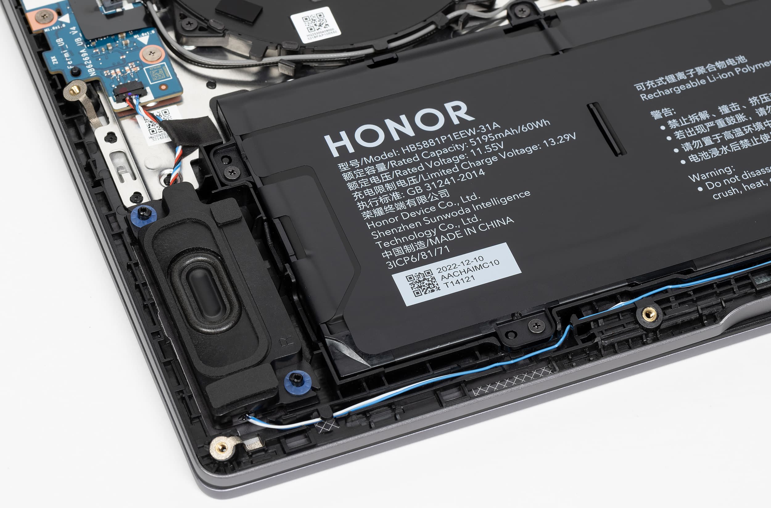 Емкость съемного аккумулятора в Honor MagicBook X 14 2023 составляет 60 Вт·ч (5195 мА·ч).