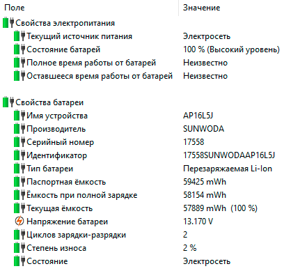 Правда, по данным диагностических утилит, фактическая емкость составила 58,15 Вт·ч, что немного меньше паспортной.