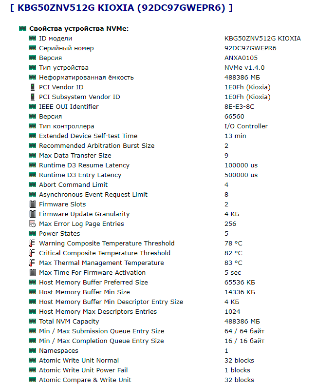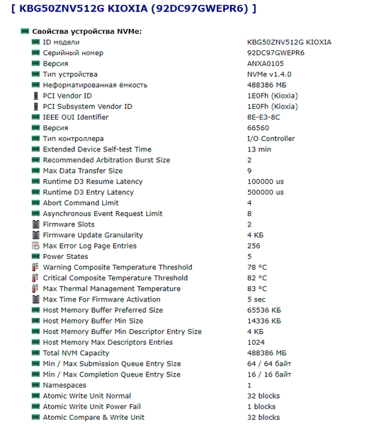 В нашей версии ноутбука установлен накопитель Kioxia KBG50ZNV512G, но по сложившейся практике вполне допускаем, что в одной и той же модели ноутбука Honor могут попадаться SSD разных производителей.