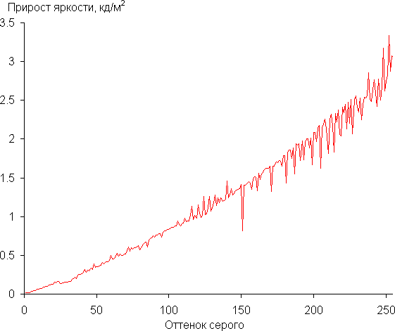 Далее мы измерили яркость 256 оттенков серого (от 0, 0, 0 до 255, 255, 255). График ниже показывает прирост (не абсолютное значение!) яркости между соседними полутонами:
