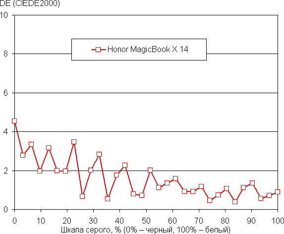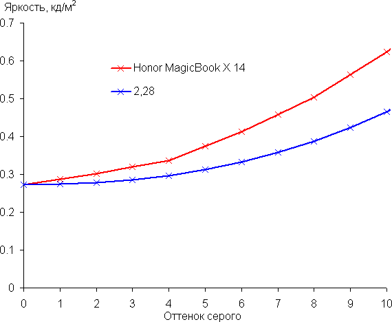 Рост прироста яркости довольно равномерный, и каждый следующий оттенок ярче предыдущего. В самой темной области аппаратно и визуально различаются все оттенки: