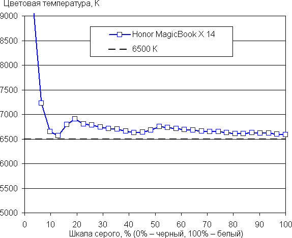После коррекции баланс оттенков на шкале серого стал лучше, так как цветовая температура еще больше приблизилась к стандартным 6500 К, и отклонение от спектра абсолютно черного тела (ΔE) снизилось. При этом цветовая температура и ΔE мало изменяются от оттенка к оттенку — это положительно сказывается на визуальной оценке цветового баланса. (Самые темные области шкалы серого можно не учитывать, так как там баланс цветов не имеет большого значения, да и погрешность измерений цветовых характеристик на низкой яркости большая.)
